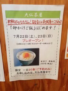 NPO法人 大佛三郎 2017/07/19 【イベント情報】「だいぶつ朝食堂」プレオープン(7/22・23) ★詳しい情報はこちら★【7/22,23プレオープン】だいぶつ朝食堂(Facebookイベントページ)高岡大仏からすぐ近くにある「たかおか大仏茶屋」にて、卵かけご飯朝食を始めます。というわけで、今週末の7月22日(土)と23日(日)、プレオープンいたします!!ご提供するのは、「仁光園」「前崎養鶏」「ひかりがま農園」さんが生産する卵を使った「卵かけご飯」となります。そのほかにも、庄川の伏流水を使い、昆布や鰹で丁寧にだしをとったお味噌汁や地元農家さんの漬物が付きます!ぜひ、高岡の地元素材を使った、こだわりの逸品をご賞味ください。一日のはじまりは、一杯のたまごかけご飯から。皆様のご来店お待ちしております。だいぶつ朝食堂 プレオープン営業日:2017年7月22日(土)・23日(日)営業時間:朝6時30分~9時(ラストオーダー8時30分) ※ご都合の良い時間帯にお越し願います。販売食数:1日限定20食 ※要予約・食数に限りがございますので、事前予約制をとらせていただいております。・ご来店いただけるお客様は、お手数ですが、Facebookページに参加表明いただきますようお願いいたします。価格:500円(税込) たまごかけご飯、味噌汁、漬物付駐車場:大仏茶屋の駐車場には限りがありますので、御旅屋市営駐車場をご利用ください(入庫から1時間無料となります)。たかおか大仏茶屋の地図(Googleマップ) http://kirittotakaoka.ria10.com/saburou/201707192000【イベント情報】「だいぶつ朝食堂」プレオープン(7/22・23)