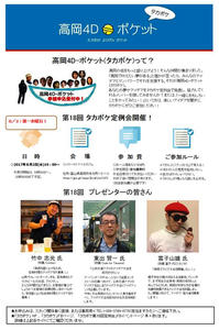 高岡4D-ポケット タカポケ 2017/07/29 【イベント情報】タカポケ 第18回定例会(8/2) ★詳しい情報はこちら★タカポケ 第18回定例会(Facebookイベントページ)高岡4D-ポケット(たかおかよじげんポケット)=通称「タカポケ」)第18回定例会開催日決定!★参加お申込受付中★「ぜーんぶジブンゴト!」トナリのこともジブンゴト、マチのこともジブンゴト。高岡のために何かやりたい!自分の夢をみんなに応援してほしい!もっとこうしたら街がよくなる!みんなと一緒に高岡の幸せな未来をつくりましょう!!タカポケ 第18回定例会開催日時:2017年8月2日(水)19:00~(18:30受付開始)開催場所:メリースマイルカフェ(高岡市本丸町13-10)定員:30名参加費:500円 ※お得な会員制度を始めました! 4月から9月会員 (会員の方は全額で2,000円)懇親会:定例会終了後、楽しすぎる懇親会をご用意しています。(参加費1,500円)~参加方法~ ・Facebook・・・イベントページ参加ボタンを押す&コメントを必ずお願いします。定例会&懇親会参加についてもご回答ください。・TEL・・・事務局へ直接お申込みください。 080-3749-8770(担当:ますかた)~プレゼンター~・東出 賢一 氏(所属 Code for Takaoka)「公共交通アプリのアイデア大会を成功させたい」・竹中 志光 氏(所属 Craftan)「高岡を盛り上げるため、名物料理のアイデアを大募集!」・富子 山雄 氏(所属 富子プロスタジオ)「高岡でクイズ大会を開催したい!」当日はプロジェクトアイデアを持ったプレゼンターの発表内容を聞いたあと、そのアイデアを参加者全員でブラッシュアップ。さらに、そのプロジェクトを応援し、一緒にがんばってくれる協力者を募ります。(次回以降のプレゼンターさんをただいま募集中!)アイデアを出し合って、思いを形にし、仲間と一緒に高岡を盛り上げるプロジェクトをどんどん実行していきましょう。誰かの夢をみんなで叶える、高岡4D-ポケット(タカポケ)。ぜひご参加ください!色んな方との交流も生まれます。お名刺をお持ちの方は是非お持ちくださいませ。>>>タカポケって?https://peraichi.com/landing_pages/view/takapoke~当日スケジュール~19:00~20:30 定例会定例会終了後~ 懇親会を開催します!タカポケ第18回定例会会場・メリースマイルカフェの地図(Googleマップ) http://kirittotakaoka.ria10.com/takapoke/201707291600【イベント情報】タカポケ 第18回定例会(8/2)