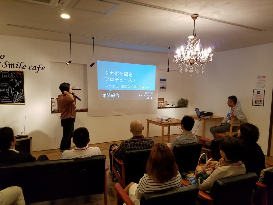 高岡4D-ポケット タカポケ 2017/05/15 【イベント参加報告】タカポケ 第15回定例会(5/12) 5月12日(金)。メリースマイルカフェにて、高岡4D-ポケット(通称・タカポケ)の第15回定例会が開催されました。先日、スマホデビューを果たした私は、今回現地でのFacebookリアルタイム投稿を担当させていただきました。プレゼンに入る前に、以前プレゼンをされた方の、進捗報告。まずは、第3回定例会(2016年4月)でプレゼンターを務めた、瀧根康弘さん(所属・ひょっこりひょうたん倶楽部)。当時のプレゼンテーマは『千保川クルーズで新しい企画をやりたい!』。タカポケで集まったアイディアをもとに、今年4月の「千保川さくらクルーズ」で実行したことを、発表されました。続いて、タカポケメンバーでプロジェクト進行中の「タカポケ鍋」について。第12回定例会(2017年1月)のプレゼンター・元道彩さん(所属・高岡4D-ポケット)より発表がありました。2018年1月の、日本海高岡なべ祭り出店を目指して・・・。進捗報告に続き、いよいよ本題へ。今回のプレゼンターの皆様による、プレゼンタイム。プレゼンター① 瀧根康弘さん(所属・ひょっこりひょうたん倶楽部)テーマ『GOGO!魅惑のほたるツアーキャンプ!本格ピザ窯でグランピング体験をしよう!』進捗報告もしてくださった瀧根さん。千保川クルーズで大活躍中のEボートで、今度は五位ダムでのクルーズ企画に挑戦。子どもたちが楽しめるツアーキャンプのアイディア募集!プレゼンター② 八田一弥さん(所属・八田塾)テーマ『高岡忍者の卵たちを活躍させたい!』8月に開催される「高岡大仏むすび縁日」にて、八田塾塾生の子どもたちに、何か世の中に役立つミッションを与えられないか?とにかくすごいアイディアを募集!!プレゼンター③ 竹平政男さん(所属・ペレットストーブのシモタニ)テーマ『街中にペレットのある暮らしを広めたい』木質を燃料とし、やさしいあたたかさで室内を温めてくれる「ペレットストーブ」。山町ヴァレーにて、ペレットストーブのある空間ができます!プレゼンの後は、各プレゼンター毎にチーム分け。参加者の方は興味のあるプレゼンターのところへ集まり、アイディア出しタイム!そして、アイディア出しが終わった後、再び全員集合!プレゼンターの皆様に集まったアイディアを発表し、それを踏まえての「はじめの一歩」を発表していただきました。今回もアツい時間となったタカポケ。次回は、6月7日(水)、平米公民館での開催となります。定例会終了後の懇親会では、5月に誕生日を迎えた芸人・富子山雄さんのサプライズ祝いもありました! http://kirittotakaoka.ria10.com/takapoke/201705151500【イベント参加報告】タカポケ 第15回定例会(5/12)