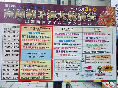 イベント参加報告 2017/05/04 【イベント参加報告】第42回たかまちまつり 高岡獅子舞大競演会(5/3) 5月3日(祝・水)。高岡市中心市街地にて、「第42回たかまちまつり 高岡獅子舞大競演会」が開催されました。獅子舞が盛んな富山県。高岡を中心とした県内の獅子舞団体が参加し、中心市街地3会場の特設ステージで競演しました。当日は、ウイング・ウイング高岡会場横に設置されました、「獅子舞工房 久宗」のブースをお手伝いさせていただきました。獅子舞工房久宗を営む高畠氏は、私の博労小・南星中時代の同級生。自ら製作した獅子舞グッズを販売しております。思えば、高岡獅子舞大競演会に足を運んだのは、中学時代に高畠氏に誘われた時以来、十数年ぶりでした。正直、獅子舞とは縁もないまま育ったため、「富山県は獅子舞が盛ん」ということがピンと来ていませんでした。今回、久々に獅子舞大競演会に足を運び、獅子舞という文化の素晴らしさ、そしてその文化に携わる人たちの情熱を感じることができて、本当に良かったなと思います。 http://kirittotakaoka.ria10.com/houkoku/201705042100【イベント参加報告】第42回たかまちまつり 高岡獅子舞大競演会(5/3)