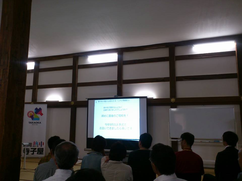 イベント参加報告 2016/06/05 【イベント参加報告】高岡熱中寺子屋 第1回オープンキャンパス(6/4) 国宝瑞龍寺にて。6月4日(土)、国宝瑞龍寺にて、「高岡熱中寺子屋 第1回オープンキャンパス」が開催されました。瑞龍寺住職の四津谷道宏先生(禅)、料理家の山田玲子先生(家庭)、株式会社ヒューマンセントリックス代表取締役の中村寛治先生(放送)、ワタベウェディング株式会社顧問の梶明彦先生(観光開発)という豪華講師陣による講義が行われました。料理家・山田玲子先生による家庭科の講義では、「おにぎりは日本のソウルフードとして今世界で注目されている」という話を学び、瑞龍寺の大釜で炊いたご飯で握った特製おにぎりが振る舞われました。中村寛治先生による放送の講義は、映像制作を趣味でやったことのある私にとって、とても興味深い話でした。食を通じた交流語る…「熱中寺子屋」(読売新聞 2016年6月5日)なお、このオープンキャンパスの様子は県内各メディアで報道されましたが、そのうち読売新聞さんの記事に私のインタビューが掲載していただきました。ありがとうございます。(上記記事より一部引用)>同市鐘紡町の福岡経さん(24)は「地元の観光を盛り上げていきたいので参加した。知らなかったことを数多く学べたので、9月からの授業もぜひ受講したい」と話した。第2回目のオープンキャンパスは8月6日(土)に開催予定。そして、9月3日(土)より開校されるとのことです。 http://kirittotakaoka.ria10.com/houkoku/201606050900【イベント参加報告】高岡熱中寺子屋 第1回オープンキャンパス(6/4)