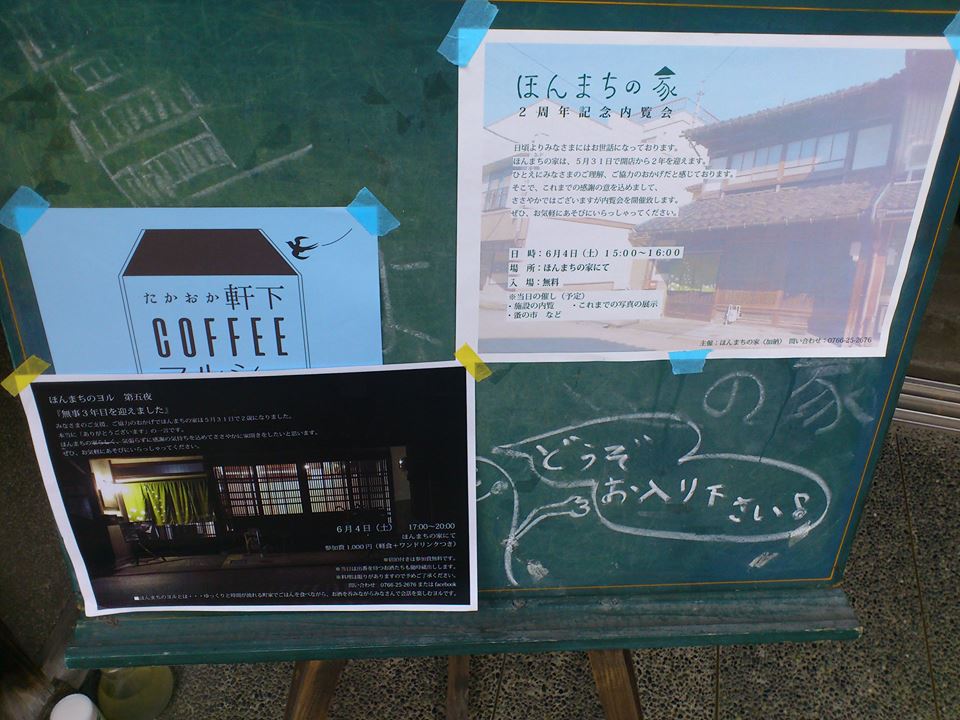 イベント参加報告 2016/06/05 【イベント参加報告】町家体験ゲストハウスほんまちの家2周年イベント「ほんまちのヨル」(6/4) ほんまちの家ホームページ(外部リンク)6月4日(土)。高岡市本町の空き家を活かして2014年にオープンした、町家体験ゲストハウス「ほんまちの家」の2周年イベント「ほんまちのヨル」に参加させていただきました。瑞龍寺から徒歩で直行しました(笑)ほんまちの家は一度訪れてみたかった場所なので、この機会に足を運ぶことができて良かったです。東京工業大学や富山大学芸術文化学部の学生さんを中心に作られ、運営されているほんまちの家。こんな学生時代を過ごしてみたかったなと思うと同時に、若いパワーをちょっとだけいただくことができたように思います。また、この日関東からの宿泊客がいらっしゃって、とても楽しまれていました。 http://kirittotakaoka.ria10.com/houkoku/201606051000【イベント参加報告】町家体験ゲストハウスほんまちの家2周年イベント「ほんまちのヨル」(6/4)