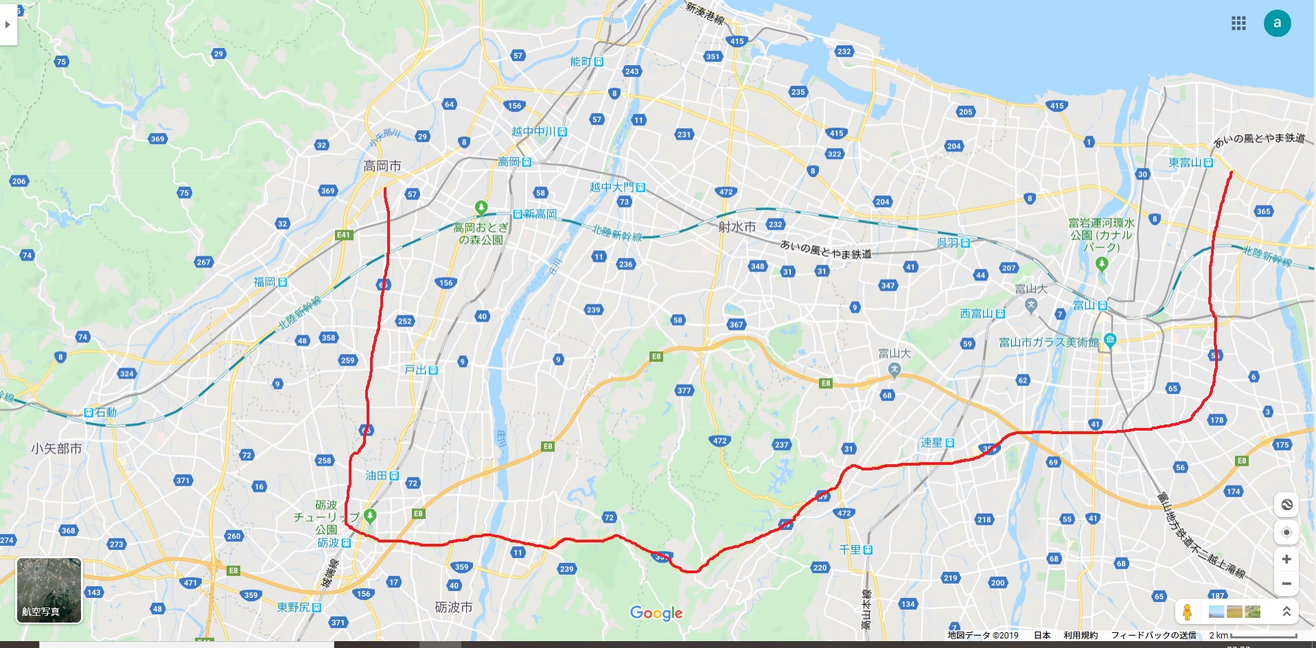なんとまあ、見事な形で、富山と高岡という富山県の二大都市を結ぶ一本道なのです。