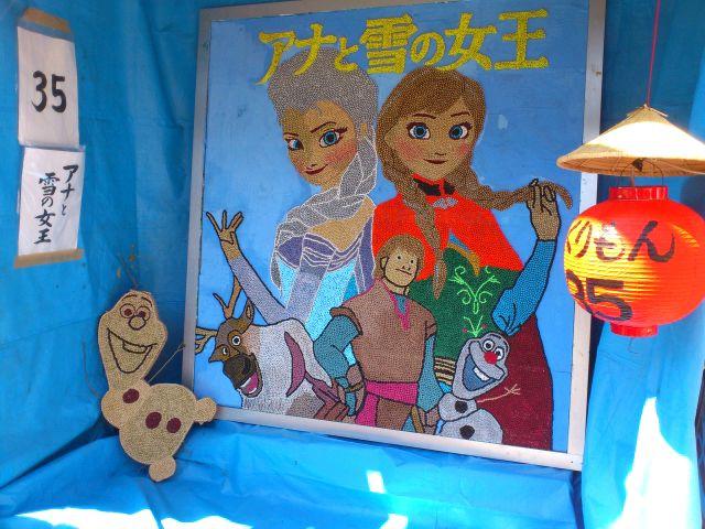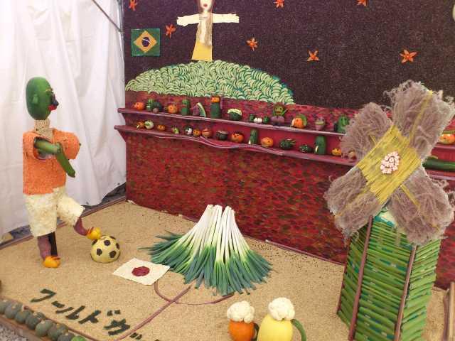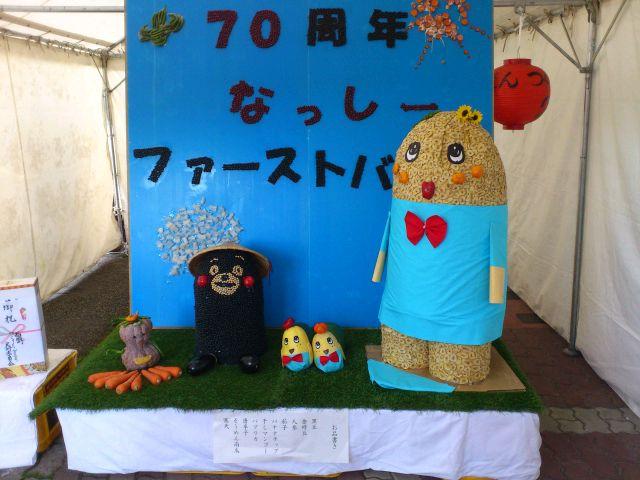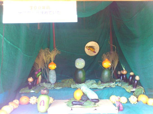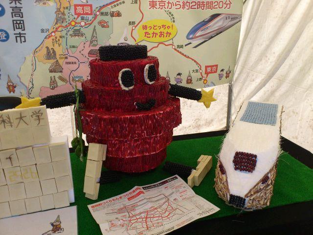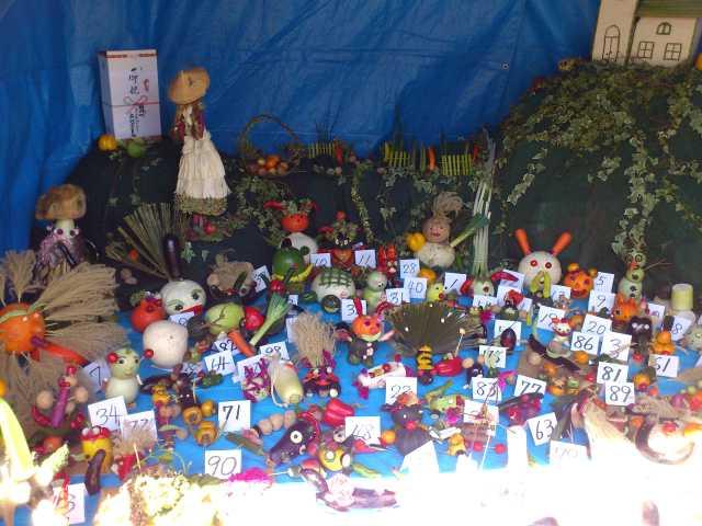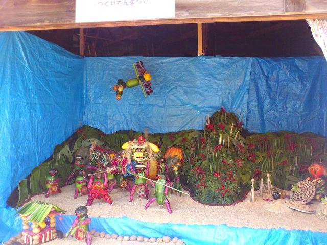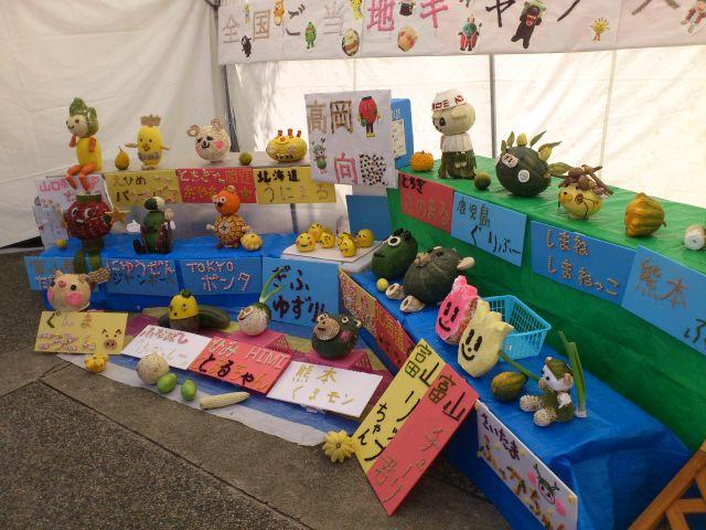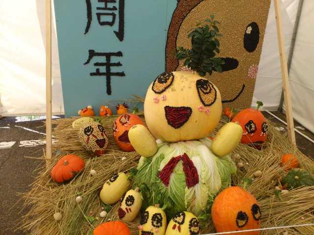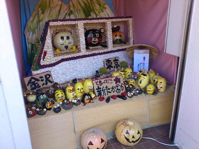 イベント参加報告 2014/09/23 福岡町つくりもんまつりに行ってきました(9/23) 今日は福岡町つくりもんまつりに行ってきました。中田かかし祭りに続き、今回初めて行きました。福岡町の中心市街地に、42の「つくりもん」が展示されていました。今回は、その一部をご紹介したいと思います。(作品番号は無料パンフレットに書かれていたもので、ブログでの掲載順は私が見た順番です。したがって、番号順になっていませんので予めご了承ください ^^;)(1)曳山(さくらの木歯科隣)制作:爆笑会とゆかいな仲間たちまずはこちらから目に入りました。偶然、作品No.も1番でした(笑)立派な曳山の形ですが、これも野菜や果物で創られた「つくりもん」なのです。(3)午(うま)(福岡駅前テント)制作:西日本鉄道OB会高岡支部今年の干支ですね。サラブレッドっぽいのが嬉しいところです。(5)僕等の街に新幹線がやって来る(福岡駅前テント)制作:高岡法科大学学生会大学生による作品です。かかし祭り同様、新幹線関連の作品が多かったですね。戸出七夕まつりのマスコットキャラクター「たなっちょ」の赤は、唐辛子で彩られているので辛そうでした。(4)富山銀行60周年 番犬トミーとフナッシー(福岡駅前テント)制作:富山銀行福岡支店かかし祭り同様、ふなっしーが各所におりました。(9)ワールドカップ(旧高岡信金跡テント)制作:京都文教大学わざわざ京都から大学生の方が作品を展示されていました。今年はサッカーワールドカップがありましたね。すっかり忘れていました(笑)(25)福を運ぶ新幹線(石澤宅車庫)制作:中央通自治会七福神が乗っているのは、写真では切れてしまっているので分かりにくいですが新幹線です。(26)北陸新幹線とその愉快な仲間たち(北陸銀行福岡支店車庫)制作:北陸銀行福岡支店ふなっしー、くまモン、そして入善町のジャンボ~ル三世がいます。こちらでも、新高岡駅「かがやき」停車を求める声。(23)かがやけ3年生!Sunshine -新しいグラウンドうれしいな-(ミュゼふくおかカメラ館駐車場)制作:福岡小学校3年生小学生の皆様による作品が並べられております。また、小学生の皆様によるつくりもんまつりの紹介もありました。(21)全国ご当地キャラ大集合!(ミュゼふくおかカメラ館駐車場)制作:高岡向陵高校 生活系・情報系こちらは高校生の皆様の作品。北から南まで全国各地のご当地キャラがいました。(19)秋(ミュゼふくおかカメラ館前駐車場)制作:堀川町自治会秋の農村の風景でしょうか。やはり秋の収穫がテーマのお祭りですから。奥にはかかしもありました。(18)地球の仲間たち(大野てる子宅車庫)制作:キラッと福岡ネットこちらはたくさんの作品が並べられており、大人気でした。(35)アナと雪の女王(旧上田酒店)制作:大蔵町自治会大ヒットのこの映画もつくりもんになりました。豆で制作したそうです。(34)つくりもんビフォアーアフター(旧中田米穀店)制作:大蔵町自治会上がbefore:300年前の地蔵祭の風景下がafter:現在のつくりもんまつりの風景なんということでしょう!!(お決まりの)(39)軍師官兵衛(小林務宅車庫)制作:旭町自治会今年のNHK大河ドラマもつくりもんとして登場です。(38)雨晴から立山連峰を望む(みゆき美容院車庫)制作:早稲田町自治会高岡が世界に誇る絶景も、つくりもんで表現されました。(41)旭町 第九(四十一万地蔵隣テント)制作:旭町自治会第九の演奏風景。個人的には一番感動したかもしれません。(32)伝統のスゲ笠作り(北陸電力営業所跡地)制作:中町自治会福岡町を代表する伝統産業・菅笠作りもつくりもんで表現されました。(30)まぁ!ライオン?(仁寿酒販倉庫)制作:新栄町自治会言うまでもなく、シンガポールの「マーライオン」です(笑)本当に水が出ていました。ちなみに、この作品は唯一国道8号線から確実に見える場所にあります。(他にも国道8号線沿いにある作品はいくつかありますが、だいたいテントの中で見えなかったりするので・・・)(29)ふなっしー(富山第一銀行福岡支店)制作:富山第一銀行福岡支店ふなっしーだけでなく、くまモンもいました。(6)末広藤娘(JAいなば倉庫)制作:末広町自治会おそらく唯一の巨大作品。写真の下の方に人の頭が見えるので、巨大であることはお分かりいただけると思います。(8)'絆' おかえり(JAいなば倉庫)制作:地域女性ネット高岡 福岡地区婦人会心温まる、「おかえり」の風景です。というわけで、福岡の街をぐるーっと回って、色んな「つくりもん」作品を目にすることができました。最初にも書いた通り今回が初めてでしたが、野菜や果物でここまでクオリティの高いものができるんだなと、とにかく感動させられました。本当に素晴らしいお祭りなんだなと実感いたしました。見に行くことができて良かったです。さて、福岡町つくりもんまつりは明日まで開催されております。明日は平日ではありますが、お時間のある方はぜひ福岡町に足をお運びください。 http://kirittotakaoka.ria10.com/houkoku/201409232000福岡町つくりもんまつりに行ってきました(9/23)