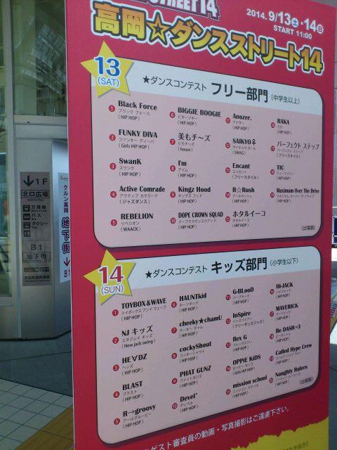 (公社)高岡青年会議所 2014/09/14 高岡☆ダンスストリート14、見に行ってきました 9月13日(土)・14日(日)の2日間、クルン高岡特設会場で開催された「高岡☆ダンスストリート14」。2日目の14日(日)、見に行ってきました。(先日の更新で13日(土)がキッズ部門、14日(日)がフリー部門と告知させていただきましたが、13日(土)フリー部門、14日(日)キッズ部門の誤りでした。お詫びして訂正いたします。)イベント開始前の会場。イベントの様子。踊っているのは1人に見えますが、奥にもう1人隠れています(笑)イベント会場の場所がよく分かる写真(笑)今日は小学生以下によるキッズ部門。県内外の20チームがダンスパフォーマンスを競いました。パフォーマンスのレベルの高さに驚きました。また、会場周辺には多くの方が集まり、クルン高岡は大賑わいでした。このイベントの主催者は、高岡青年会議所の有志の方を中心とした皆様。昨年のこのイベントでも大変お世話になりました。今日は青年会議所の皆様とも再会できて、とても嬉しかったです。さて、今日は青年会議所の皆様が制作された「かがやきビデオクリップ」の完成披露会も行われましたが・・・私は都合により、その前に帰らなくてはならず、見られなくて残念です・・・。新幹線開業に向けて、色んな方が高岡を盛り上げていく姿を見ることができ、いい時間を過ごすことができました。私も何かしらの形で力になれたらいいなと思います。 http://kirittotakaoka.ria10.com/takaokajc/201409142200高岡☆ダンスストリート14、見に行ってきました
