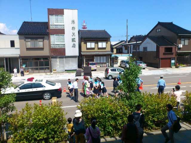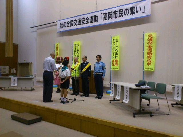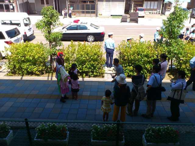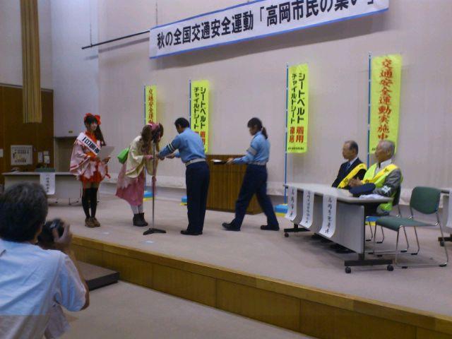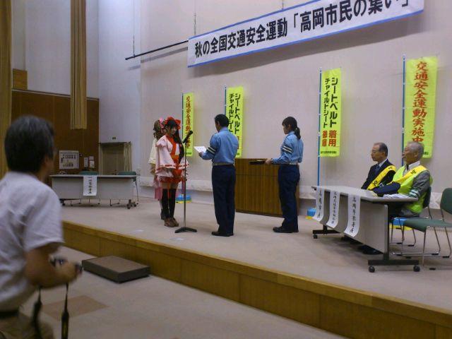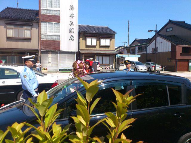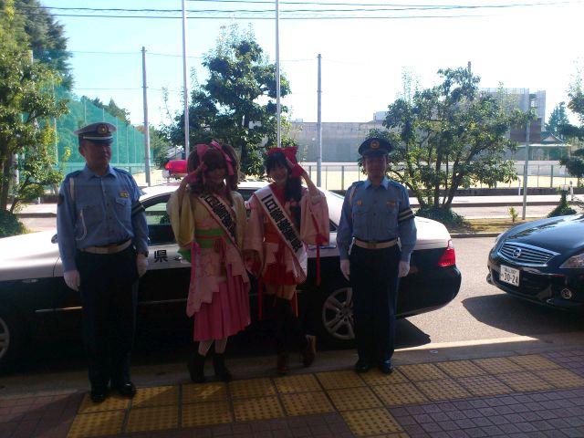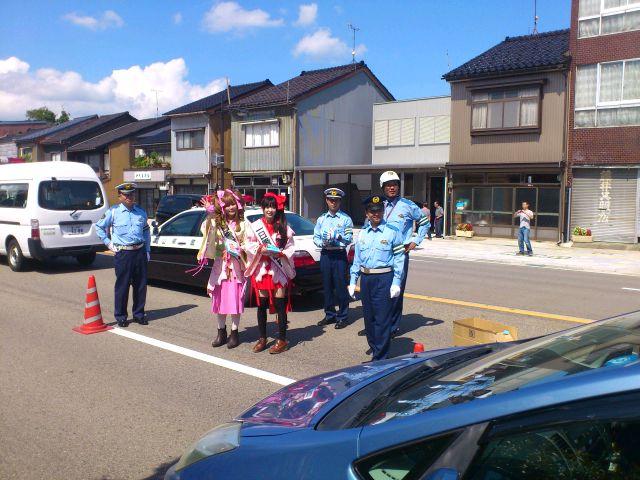 観光・イベント情報 2014/09/21 あみたん娘・一日警察署長に就任!(9/21) 昨日お伝えした通り、本日高岡市ふれあい福祉センターにて「秋の全国交通安全運動 高岡市民の集い」が開催され、高岡市観光大使・あみたん娘が高岡警察署の一日署長に就任いたしました。高岡市民の集いは10時からスタート。高岡警察署長より、一日署長の委嘱状を受けるあみたん娘・カノン(空野青空さん)。同じく、一日署長の委嘱状を受ける、あみたん娘・セシル(桜井コウさん)。その後、一日警察署長・あみたん娘による挨拶が行われました。博労地区の老人会と、交通少年団の代表の方による、交通安全宣言。最後に、富山県警察音楽隊による演奏が行われました。警察音楽隊の演奏を聞くのは、開町400年の時以来でした。「HERO」「花子とアン」と、ドラマテーマ曲が続いた後、AKB48の大ヒット曲「恋するフォーチュンクッキー」などが演奏されました。また、「男はつらいよ」の演奏に合わせた、交通安全・詐欺注意の呼びかけなども行われました。11時頃に市民の集いは終了し、一日警察署長・あみたん娘はいよいよ交通安全キャンペーンに出発。パトカーに乗って、キャンペーン会場まで移動しました。さて、無関係な話になりますが・・・。市民の集いの会場・ふれあい福祉センターの向かいには、私の母校・博労小学校があるのですが・・・。耐震工事ですごいことになっていました。白金町地内(県道40号線・南町交差点手前)にて、交通安全キャンペーンが行われました。一日警察署長・あみたん娘が、ドライバーにグッズを手渡し、交通安全を呼びかけました。子どもたちと写真撮影をする、一日警察署長・あみたん娘。30分程で全てのグッズを配り終え、キャンペーンは終了。キャンペーンには、小学生の皆様も参加されていました。ちなみに、最後の2枚はどこから撮ったかと言いますと、線路下の公園にあるジャングルジムの頂上です(笑)あみたん娘のお二人にとっては、貴重な経験になったのではないかなと思います。そして、悲惨な事故が起こらない安全な街を目指すため、市民の皆様には、交通安全をより徹底して欲しいなと思います。 http://kirittotakaoka.ria10.com/kankou/201409212200あみたん娘・一日警察署長に就任!(9/21)