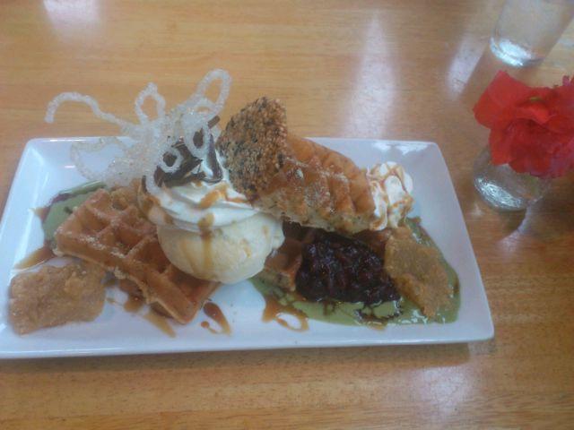 観光・イベント情報 2014/08/09 高岡昆布スイーツ初挑戦(19 HITOYASUMI 戸出店) 「ご当地○○」は、地元民に共有されていなければならない。これが大前提だと思います。企画者が頑張って「これが我が街自慢のご当地○○です!」とPRしても、そもそも地元住民が全く知らない。これではあまりにも虚しいです。また、そのご当地ものを目当てに県外から来た人にとって、地元民が「?」という顔をしてしまうのは、印象があまり良くないでしょう。県外から来た人にオススメを聞かれて「こんなところ何もないよ」と言ってしまうのと、大して変わらない話です。これは企画者側の努力不足なのか、それとも地元民の地元に対する無関心さなのか。原因はどちらにもあると思いますが、大きな課題だと思います。私は最初に書いた「ご当地○○は、地元民に共有されていなければならない」をモットーに、高岡の情報を県外の人だけでなく、高岡市民にも向けて発信していけたらなと思っています。というわけで・・・。今回は高岡のご当地グルメのひとつを紹介したいと思います。それは・・・「昆布スイーツ」。富山県は、1世帯あたりの昆布の消費金額が毎年日本一を誇ります。富山県民は、昆布が大好きなのです。高岡では近年、そんな昆布を活かした新しい食のブランドを開発しようという動きがあり、誕生したのが「高岡昆布飯」と、「高岡昆布スイーツ」であります。高岡昆布百選 高岡昆布飯 高岡昆布スイーツのホームページ(外部リンク)誕生して数年は経つと思いますが・・・実はまだ一度も食べたことがなかったので、本日、「19 HITOYASUMI 戸出店」にて、昆布スイーツのみを初挑戦してきました!!19 HITOYASUMIのホームページ(外部リンク)このお店では「高岡昆布飯」もいただくことができますが、既に昼食を済ませた後だったので、食後のデザートのみをいただくことにしたのです。まずは普通にクリームソーダを頼んだのですが・・・。アイスクリームの量に衝撃wなんか、既に満腹に近いのにこれは・・・wでも、美味しかったです。そして、いよいよ出てきました、昆布スイーツ。「高岡KOMBUワッフルサンデー」(980円・1日限定10食)です。以前放送された高岡ケーブルネットワーク・コミュニティチャンネルの番組「うわさの店探検隊」(2014年4月15日放送)によると、この中の4ヶ所に昆布が使用されているそうです。・ワッフルの生地の中・アングレーズソース・アイスクリームの上に素揚げした昆布のトッピング・昆布パウダー(「うわさの店探検隊」は、8月11日より1週間、これまでの放送が一挙再放送される予定です)なんと言っても、昆布が練り込まれたワッフルの濃厚な味に魅了されました。昆布とスイーツの相性の良さが際立っていますね。また食べたい一品です。まだ1品目ではありますが、昆布スイーツが魅力的に思えてきました。これからも、色んな場所で昆布スイーツ、そして昆布飯を堪能したいなと思います。なお、高岡昆布飯・高岡昆布スイーツの種類や提供店は、先程載せた昆布飯・昆布スイーツのホームページで紹介されておりますので、ぜひご覧になってください。 http://kirittotakaoka.ria10.com/kankou/201408092330高岡昆布スイーツ初挑戦(19 HITOYASUMI 戸出店)