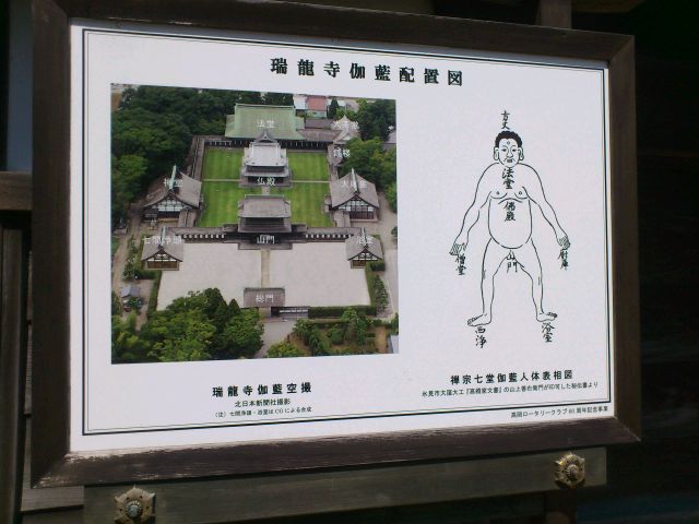 観光・イベント情報 2014/07/31 観光ボランティアガイド養成講座 瑞龍寺・前田利長公墓所編(7/26) 「観光ボランティアガイド養成講座 伏木編(6/14)」「観光ボランティアガイド養成講座 山町筋・金屋町編(6/28)」「観光ボランティアガイド養成講座 古城公園・高岡大仏編(7/12)」5月31日(土)に始まりました観光ボランティアガイド養成講座。2回目以降、現地学習会で伏木、山町筋・金屋町、古城公園・高岡大仏を案内していただきましたが、現地学習会は今回がとうとう最後。最後は、高岡の代表的な観光地・国宝瑞龍寺です。高岡駅瑞龍寺口(南口)より徒歩10分。私の家からもだいたい徒歩10分くらいで、最後にして一番楽な移動だったのですが(笑)この7月26日(土)は富山県内が猛暑日に襲われ・・・。色々大変でした(笑)国宝・高岡山瑞龍寺は、加賀藩2代藩主前田利長の菩提を弔うため、3代藩主前田利常によって建立された寺院です。利長の死後、1650年頃から伽藍の本格的整備が行われ、1663年に完成しました。当時、寺域は約36,000坪で周囲にお濠があり、まさに城郭のような姿だったそうです。(瑞龍寺を囲うように存在する用水路が、お濠の名残ではないかと思います)一国一城令で高岡城が廃城になっても、高岡城の水濠等はしっかり残したり、城郭顔負けの寺院を建立したり・・・歴史的背景が色々想像できるところですが、そのあたりは知識も乏しいので省略します。1997年に瑞龍寺のうち山門、仏殿、法堂が富山県初の国宝に指定されました。2014年現在も、瑞龍寺は富山県唯一の国宝です。かつては七堂伽藍が揃っていましたが、現在は七間浄頭(東司)と浴室がありません。今後は、これらの復元が期待されます。この大きな大きな瑞龍寺を、ボランティアグループ「保与の会」の皆様の案内で、学習しました。総門前にある、瑞龍寺伽藍配置図。現在でも、瑞龍寺の規模の大きさがうかがえます。左側の空撮は、現在はない七間浄頭(東司)と浴室も合成されています。右側の絵は、瑞龍寺の七堂伽藍を人の体で表したものですが、国宝の山門が股間にあります。総門前には、法堂の鬼瓦があります。実物大です。こうやって見ると、とても大きいです。総門(重要文化財)。見ての通りですが、ここから、中に入ります。総門を通ると見えるのが、山門(国宝)。(通らなくても見えるか)一度火災で焼失しましたが、1820年に再建されました。門の両端には、金剛力士像があります。山門を通ると、続いて見えるのは仏殿(国宝)。今まで意識していなかったもので、屋根が鉛でできているというのを初めて知りました。そして、中は相当久々に入ったような気がします。見えにくいですが、その奥には法堂(国宝)があります。この猛暑日でしたが、法堂や回廊に入ると風が通って涼しかったです。法堂裏(南側)、写真ではとても見にくくなりましたが、前田利長、前田利家、織田信長、同室正覚院、織田信忠を祀る5つの石廟(富山県指定文化財)があります。この他、坐禅修行を行う僧堂(重要文化財)も案内していただきました。あまりにも広く、しかも暑い日だったので、短い時間で全てを案内するのは大変ですよね・・・。瑞龍寺の受付近くにある案内板。瑞龍寺の学習を終え、しばらくの休憩の後、この案内板にある前田利長公墓所を案内していただきました。瑞龍寺から前田利長公墓所へ行く際には、この八丁道を通ります。その名の通り八丁(約870m)ある参道で、道の中央部は石畳の遊歩道となっています。遊歩道には、合計114基の灯籠が並びます。八丁道には、前田利長の像があります。前田利長公墓所(国指定史跡)。利長の33回忌にあたる1646年に、3代藩主利常によって造営されました。現在の墓域は約10,000平方メートルですが、造営当時の墓域はその3倍以上の約33,000平方メートルで、二重の濠に囲まれています。また、墓碑も約11.75mと高く、武将個人の墓所としては国内最大級の規模と言われます。2009年2月12日、金沢市の野田山にある前田家墓所とともに「加賀藩前田家墓所」として国指定史跡に選ばれました。現在残されているお濠は、内濠の一部のみですが、かつての規模からも高岡の誇る史跡のひとつと言っていいと思います。再び八丁道を歩いて瑞龍寺前に戻り、観光ボランティアガイド養成講座最後の現地学習会は猛暑の中終了しました。瑞龍寺は、小学5年時(2002年)の「親子のつどい」で一度案内していただいたことがあるのですが、まあ詳しいことは覚えているわけもなく・・(笑)その午後、更に「親子のつどい」の一環で、雨の中ポップサーカスを見に行ったことの方がよく覚えています(笑)近所にありながらそれ以降は10年近く足を運ばず、大学生になって以降、ライトアップに何度か足を運んだくらいでした。今まで漠然と「すごい寺なんだな」と思ってはいましたが、今回の学習会で建築技法など様々なことを学ぶことができ、改めてそのすごさを知ることができました。暑い中案内してくださった保与の会の皆様、本