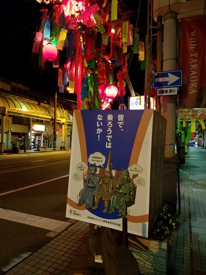 観光・イベント情報 2017/08/03 【イベント情報】高岡七夕まつり 開催中(~8/7) 8月1日(火)。日本三大七夕まつり(?)の、高岡七夕まつりが開幕しました。高岡駅前の末広町通りは、沿道がジャンボ七夕で彩られています。末広町通りにある文苑堂書店の前には、ドラえもんの七夕飾りが。その近くには、高岡熱中寺子屋制作の七夕もありました。その近くには、面白いロゴが(笑)高山右近、前田利長、大伴家持が、新幹線に乗っている??写真撮影時は消灯しておりましたが・・・。ウイングウイング高岡前広場には、高岡商工会議所青年部さんによる七夕飾りがありました。今年はパワーアップ?何やらモニターが導入されておりました。さて、高岡七夕まつりは7日(月)まで開催されております!5日(土)・6日(日)の夜は、末広町通りが歩行者天国となります。ぜひ、願いを叶えに、高岡に来てみられ~。★詳しい情報はこちら★高岡七夕まつり(たかおかストリート)イベントチラシ(PDF)高岡七夕まつり開催日:2017年8月1日(火)~7日(月)開催場所:高岡市中心市街地・・・高岡駅北口側、クルン高岡2階、末広町通りなど~イベントスケジュール(抜粋)~8月1日(火)(終了)18:30~ オープニング クルン高岡2階 デッキ 願い短冊の杜 クルン高岡B1ステージ(8/1~7開催) 16:30~20:30 夜町ビアテラス クルン高岡2階 デッキ(8/1、3~6開催) 島 香織 LIVE 19:30~8月4日(金) 19:00~ JAZZ-Live 高岡大和横@パーク 19:00~ Aya&Jazz Tricolore Torio LIVE クルン高岡2階 デッキ19:45~20:30 北日本新聞納涼花火高岡会場 庄川・高岡大橋上流17:00~21:00 ダイワ屋台村 高岡大和横@パーク(8/4~6開催)18:00~21:00 ビアガーデン ウイング・ウイング高岡(8/4~6開催)8月5日(土)・6日(日) 18:00~20:30 歩行者天国 末広町・末広坂 8月5日(土)18:00~ 民謡のど自慢大会 高岡大和横@パーク18:00~20:30 3on3 ストリートバスケット 末広町18:00~ たかまちフレンドパーク 末広町(8/5・6開催)18:00~20:30 末広坂フェスタ 末広坂10:00~19:00 ワンコインモール クルン高岡2階・B1(8/5・6開催) 10:30~12:00 B1こども映画上映会 クルン高岡B1(8/5・6開催)8月6日(日)14:00~20:00 オタヤアーケード ライブ&ビアガーデン 御旅屋通り18:00~20:30 サマーナイト・カクテルフェスタ 末広町 19:00~21:00 Kikare~Ma 2017 願い音の祭典 高岡大和横@パーク19:30~ 民謡踊り街流し 末広町19:50~ 消防音楽隊演奏 末広町8月7日(月)10:30~ 願い短冊お焚き上げ 射水神社会場周辺(末広町通り)の地図(Googleマップより) PR http://kirittotakaoka.ria10.com/kankou/201708031500【イベント情報】高岡七夕まつり 開催中(~8/7)