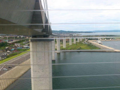 管理人のつぶやきその他 2014/08/08 脈絡のない旅 砺波市で迎えた朝・新湊大橋「あいの風プロムナード」(8/3) 8月2日(土)、イオンモールのあみたん娘ぬりえ展を見た後、友人と飲んで夜には帰宅しましたが、何故か眠れず・・・。結局一睡もしないまま、8月3日(日)早朝、高岡駅前へ。早朝の高岡七夕を見るのはさすがに初めてでした。そして、そのまま砺波市へ。砺波市にできるイオン建設現場。北陸一になるとか・・・。そして、個人的にお気に入りの写真。砺波市の祖母の家から撮った、幻想的(?)な朝の風景。立山連峰も奥に見えました。更に、まだ7時になるかどうかというくらいの時間に、河川マニア炸裂。祖父川の指定区間終点へ。砺波市三郎丸、JR油田駅から北に約200m、城端線のすぐ東側にあります。この看板を撮るのはなかなか大変でした。時間的に逆光だったし・・・。祖父川は指定区間終点からすぐに、城端線の下を流れます。その後、千代交差点付近で国道156号線を通り、戸出、本保、西高岡駅付近、北島などを経由し、国條橋すぎの岩坪地内で小矢部川と合流します。同日昼、新湊方面へ。今年3月に供用開始した、牧野大橋。新たなる立山眺望スポットだと思います。曇っていましたが、立山連峰がくっきり見えました。続いて、富山新港に架かる日本海側最大の斜張橋「新湊大橋」へ。新湊大橋から見た、新湊の名所・海王丸。新湊大橋から見た立山連峰も、素敵です。新湊大橋東詰側から、新湊大橋を眺めます。さて、写真右側にあるのはエレベーター。なんと、この新湊大橋は、自動車専用道の下に、歩行者・自転車専用道があり歩いて渡ることができるのです。その歩行者・自転車専用道は、「あいの風プロムナード」と言います。エレベーターで上まで行きました。堀岡から、越ノ潟へと向かう県営フェリーが見えました。あいの風プロムナード。こんな感じの通路です。あいの風プロムナードより、富山新港側を眺めます。夜景はきっと綺麗だろうな。でも20時までなんですよね・・・。(期間限定で21時までの時も)あいの風プロムナードより、富山湾側を眺めます。あいの風プロムナードから眺める、海王丸。あいの風プロムナード西側エレベーターより、新湊大橋西詰側を眺めます。このような大きな橋を歩いて渡れる・・・。いい経験をさせていただきました(笑)ちなみに両側エレベーター近くには駐車場も用意されています。もちろん、自転車も通れますので(ただし橋の中では乗車禁止)、通学等にも利用できます。新湊の新たなる見どころだと思うので、ぜひ利用してみてください。 PR http://kirittotakaoka.ria10.com/kanrinin/201408081645脈絡のない旅 砺波市で迎えた朝・新湊大橋「あいの風プロムナード」(8/3)