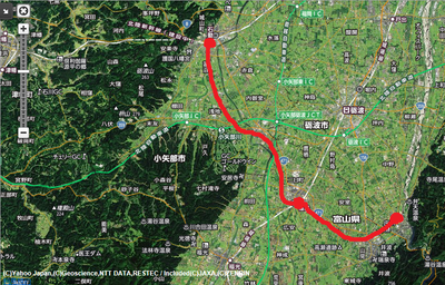 南砺市の現JR城端線 福野駅、高瀬神社、旧井波町などを経由し、砺波市旧庄川町に至る路線です。