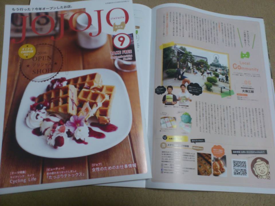 NPO法人 大佛三郎 2016/09/16 【メディア掲載】フリーペーパー『JOJOJO 呉西版』9月号に掲載していただきました ご報告が遅れましたが、女性向けフリーペーパー『JOJOJO 呉西版』9月号に、掲載していただきました。実は2ヶ月連続での登場です。先月は「TOYAMA TABLE」として、今月は「大佛三郎」としての登場となりました。呉西地区のスーパーや薬局等に置いてありますので、ぜひご覧ください。 PR http://kirittotakaoka.ria10.com/saburou/201609162100【メディア掲載】フリーペーパー『JOJOJO 呉西版』9月号に掲載していただきました