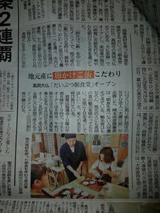 NPO法人 大佛三郎 2017/08/31 大仏茶屋の卵かけご飯朝食営業「だいぶつ朝食堂」がオープンしました!(8/27) 8月27日(日)。大仏茶屋の卵かけご飯朝食営業「だいぶつ朝食堂」がオープンいたしました。オープン初日は「たかおか朝市」の開催日とも重なり、多くのお客様にご来店いただきました。(8月28日 北陸中日新聞) (8月28日 富山新聞)高岡の食材にこだわった「卵かけご飯」。今後は、毎週金・土・日、朝6時30分~9時(ラストオーダー8時30分)の営業となります。皆様のご来店、お待ちしております!大仏茶屋の地図(Googleマップ) http://kirittotakaoka.ria10.com/saburou/201708310800大仏茶屋の卵かけご飯朝食営業「だいぶつ朝食堂」がオープンしました!(8/27)