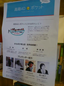 高岡4D-ポケット タカポケ 2016/02/09 高岡4D-ポケット 第1回定例会(2/5) 高岡4D-ポケット ホームページ(外部リンク)2月5日(金)、広小路のメリースマイルカフェにて、「高岡4D-ポケット(たかおかよじげんぽけっと)」の第1回定例会が開催されました。「高岡4D-ポケット」通称「タカポケ」は、鎌倉市の「カマコン」をヒントに作られた団体。定例会では、高岡を盛り上げるために活動している皆様、活動しようと思っている皆様が集い、プレゼンターがアツいアイディアを語って協力者を募るという仕組みになっています。第1回の定例会では、以下のプレゼンターの皆様がアツいアイディアを語られました。石井大地さん(高岡ワイン倶楽部オーナー)「デジタルサイネージを商店街の活性化に」山崎慶太さん(2015年囲炉裏創業)「外国人旅行者とのマッチングサービス」松本光司さん(たかおか朝市実行委員会)「~幻のマーケット~ たかおか朝市」梶川貴子さん(㈱フジタ 代表取締役社長)「町工場にメタルアートミュージアムを作りたい!」地域に対しアツい想いを持つ人は多くても、そういった方が一堂に会する場は意外と少ないと思います。地域活性化活動はちらほら存在しても、その活動同士の横のつながりが少なく、一体感のない状態があるのも現状だと思います。そういった中、このタカポケ定例会は、志を同じうするもの相集い力を合わせることの大切さを教え、よりよい地域活性化を目指すために一役買うのではないでしょうか。そして、私もいつかプレゼンターとしてアツい想いを語ってみたいなと思います。タカポケ定例会は今後毎月第1金曜日に開催されるそうで、次回は3月4日(金)の開催となります。ぜひ一度、足を運んでみてください! http://kirittotakaoka.ria10.com/takapoke/201602091700高岡4D-ポケット 第1回定例会(2/5)
