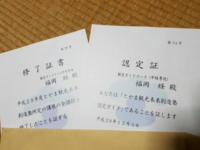 高岡観光ボランティアガイド「やまたちばな」 2017/12/14 とやま観光未来創造塾 観光ガイドコース(中級専攻)修了 今年6月より受講させていただいておりました、「平成29年度とやま観光未来創造塾 観光ガイドコース(中級専攻)」。半年の受講を経て、12月3日に修了いたしました。同時に、「とやま観光未来創造塾 認定ガイド」となりました。半年間学んだことを活かし、高岡の魅力発信に今後とも努めていきたいと思います。 http://kirittotakaoka.ria10.com/yamatachibana/201712142300とやま観光未来創造塾 観光ガイドコース(中級専攻)修了