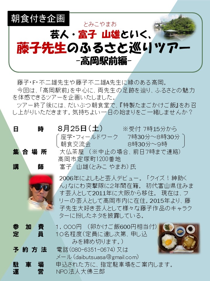NPO法人 大佛三郎 2018/08/16 【イベント情報】しあプロ★芸人・富子山雄といく、藤子先生のふるさと巡りツアー -高岡駅前編-(8/25) ★詳しい情報はこちら★しあプロ★芸人・富子 山雄といく、 藤子先生のふるさと巡りツアー -高岡駅前編-(Facebookページ)藤子・F・不二雄先生や藤子不二雄A先生に縁のある高岡。今回は、「高岡駅前」を中心に、両先生の足跡を辿り、ふるさとの魅力を体感できるツアーを企画いたしました。ツアー終了後には、だいぶつ朝食堂で、『特製たまごかけご飯』をお召し上がりいただきます。気持ちよい一日の始まりをご一緒しませんか?しあプロ★芸人・富子山雄といく、 藤子先生のふるさと巡りツアー -高岡駅前編-【日時】2018年8月25日(土) ※受付7時15分から座学・フィールドワーク 7時30分~8時30分朝食交流会 8時30分~9時【集合場所】大仏茶屋(※中止の場合、前日7時まで連絡)高岡市定塚町1200番地【講師】富子山雄(とみこ やまお)氏 2006年によしもと芸人デビュー。 「クイズ!紳助くん」なにわ突撃隊に2年間在籍。 初代富山県住みます芸人として2011年に大阪から移住。 現在は、フリーの芸人として高岡市内に在住。2015年より、「藤子先生大好き芸人」として、様々な藤子作品のキャラクターに扮したネタを披露している。【参加費】1,000円 (卵かけご飯600円相当付)【定員】10名程度(定員に達し次第、申しみを締め切ります。) 【予約方法】 Facebookページでコメントをいただくか、メール(daibutsuasa@gmail.com) に参加の旨ご連絡願います。【駐車場】 申込された方に、指定駐車場をご案内します。【運営】 NPO法人大佛三郎 http://kirittotakaoka.ria10.com/saburou/201808161800【イベント情報】しあプロ★芸人・富子山雄といく、藤子先生のふるさと巡りツアー -高岡駅前編-(8/25)