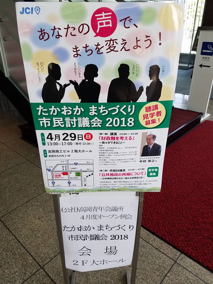 (公社)高岡青年会議所 2018/05/03 【イベント参加報告】(公社)高岡青年会議所 4月度オープン例会「たかおか まちづくり市民討議会2018」(4/29) 4月29日(祝・日)。高岡商工ビルにて、(公社)高岡青年会議所 4月度オープン例会「たかおか まちづくり市民討議会2018」が開催されました。例会は2部構成で行われました。第1部は、富山大学経済学部の中村和之教授による講演「財政難を考える」~我々ができること~がありました。そして、第2部では、18歳~40歳の市民による討議会が行われ、「公共施設の再編について」というテーマで話し合いました。昨年暮れより高岡市の財政難が報道され続ける中、若い市民が、高岡のまちづくりを「ジブンゴト」として考えるという試み。この討議会で出た意見は、後日行政に提言する予定となっております。私は一応担当委員会のメンバーでしたが・・・。前日・前々日のリハーサルは共に欠席、その上無駄に予定を詰めたために当日を寝不足で迎え、ほとんど役立たずでした。とにかく、この素晴らしい場に立ち会えたことは、一生の財産だなと思います。 http://kirittotakaoka.ria10.com/takaokajc/201805031500【イベント参加報告】(公社)高岡青年会議所 4月度オープン例会「たかおか まちづくり市民討議会2018」(4/29)