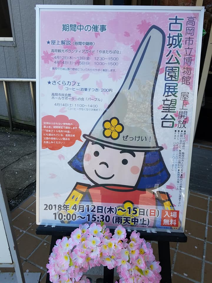 高岡観光ボランティアガイド「やまたちばな」 2018/04/13 高岡市立博物館 屋上開放「古城公園展望台」での屋上解説(4/12~15) 4月12日(木)~15日(日)の4日間、高岡市立博物館(高岡古城公園内)にて、屋上開放「古城公園展望台」が開催されております。(今年は桜の開花が早く、4月6日~8日も急遽開催されました)その中のイベントとして、高岡観光ボランティアガイド「やまたちばな」による、屋上解説があります。昨日4月12日(木)12時30分~15時00分は、私が当番日ということで、足を運んできました。普段見られない、高岡古城公園(国指定史跡高岡城跡)の絶景を楽しめる春のイベント。桜はほとんど散ってしまいましたが・・・。博物館裏に咲く、ヤマザクラの一種は、まだ花が残っておりました。屋上開放の見どころは、桜だけでなく・・・高岡大仏の横顔を見ることも。そして、古城公園の木々の向こうに、二上山を望むこともできます。屋上開放は、今日もそろそろ終わる時間ですが・・・。明後日15日(日)まで開催されます。ただ、雨天中止なので、雨予報なのが心配です。時間は、屋上開放は10時00分~15時30分。屋上解説は10時00分~15時00分となっております。入場無料となっておりますので、ぜひ、多くのご来場をお待ちしております。高岡市立博物館(高岡古城公園内)の地図(Googleマップ) PR http://kirittotakaoka.ria10.com/yamatachibana/201804131500高岡市立博物館 屋上開放「古城公園展望台」での屋上解説(4/12~15)