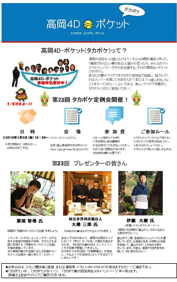 高岡4D-ポケット タカポケ 2017/12/31 【イベント情報】タカポケ 第23回定例会(1/5) ★詳しくはこちら★タカポケ 第23回定例会(Facebookイベントページ)高岡4D-ポケット(たかおかよじげんポケット)=通称「タカポケ」)第23回定例会開催日決定!★参加お申込受付中★「ぜーんぶジブンゴト!」トナリのこともジブンゴト、マチのこともジブンゴト。高岡のために何かやりたい!自分の夢をみんなに応援してほしい!もっとこうしたら街がよくなる!みんなと一緒に高岡の幸せな未来をつくりましょう!!タカポケ 第23回定例会日時:2018年1月5日(金)19:00~(18:30受付開始)場所:メリースマイルカフェ(高岡市本丸町13-10)定員:30名参加費:500円 ※お得な会員制度を始めました! 10月から3月会員 (会員の方は全額で2,000円)懇親会:定例会終了後、楽しすぎる懇親会をご用意しています。(参加費1,500円)~参加方法~Facebook:イベントページの参加ボタンを押す&コメントを必ずお願いします。 定例会&懇親会参加についてもご回答ください。TEL:事務局へ直接お申込みください。 080-3749-8770(担当:ますかた)~プレゼンター~・那須 智尋 氏:「高岡の"究極のローカライズ企画"を考えよう」・特定非営利活動法人 大佛三郎:「DAIBUTSU★NIGHTで大仏エリアの夜を...」・伊藤 大樹 氏:「高岡にも日常的に富山の人・ものに出会える家を作りたい!」当日はプロジェクトアイデアを持ったプレゼンターの発表内容を聞いたあと、そのアイデアを参加者全員でブラッシュアップ。さらに、そのプロジェクトを応援し、一緒にがんばってくれる協力者を募ります。(次回以降のプレゼンターさんをただいま募集中!)アイデアを出し合って、思いを形にし、仲間と一緒に高岡を盛り上げるプロジェクトをどんどん実行していきましょう。誰かの夢をみんなで叶える、高岡4D-ポケット(タカポケ)。ぜひご参加ください!色んな方との交流も生まれます。お名刺をお持ちの方は是非お持ちくださいませ。>>>タカポケって?https://peraichi.com/landing_pages/view/takapoke~当日スケジュール~19:00~20:30 定例会定例会終了後 懇親会を開催します! http://kirittotakaoka.ria10.com/takapoke/201712311400【イベント情報】タカポケ 第23回定例会(1/5)