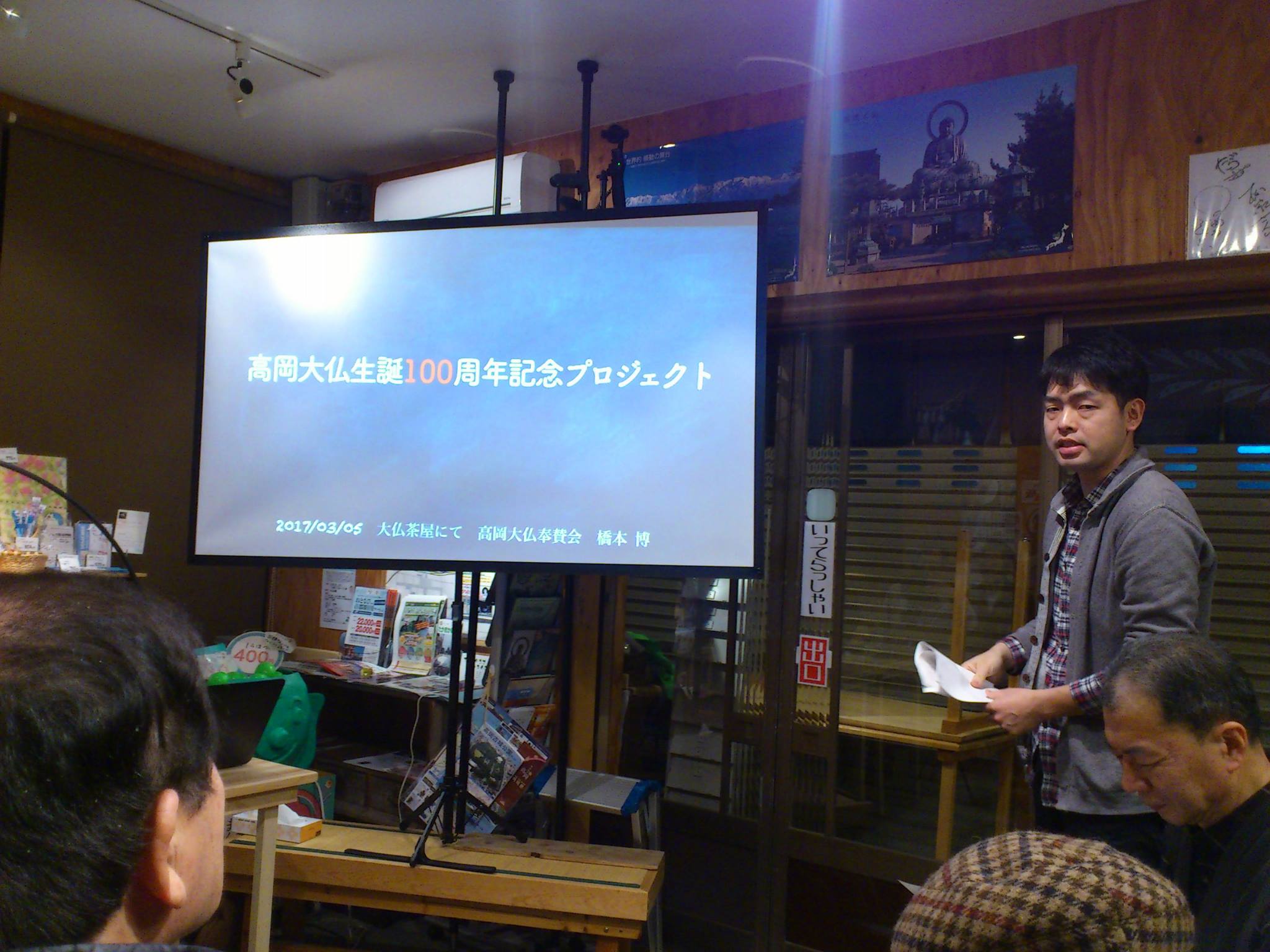2033年に高岡大仏が完成から100周年を迎えるのを祝う「高岡大仏生誕100周年記念プロジェクト」は5日、高岡市定塚町の大仏茶屋で「ダイブツナイト」と銘打った会合を開き、有志や地元住民12人が16年後に向けた取り組みについて意見を交わした。