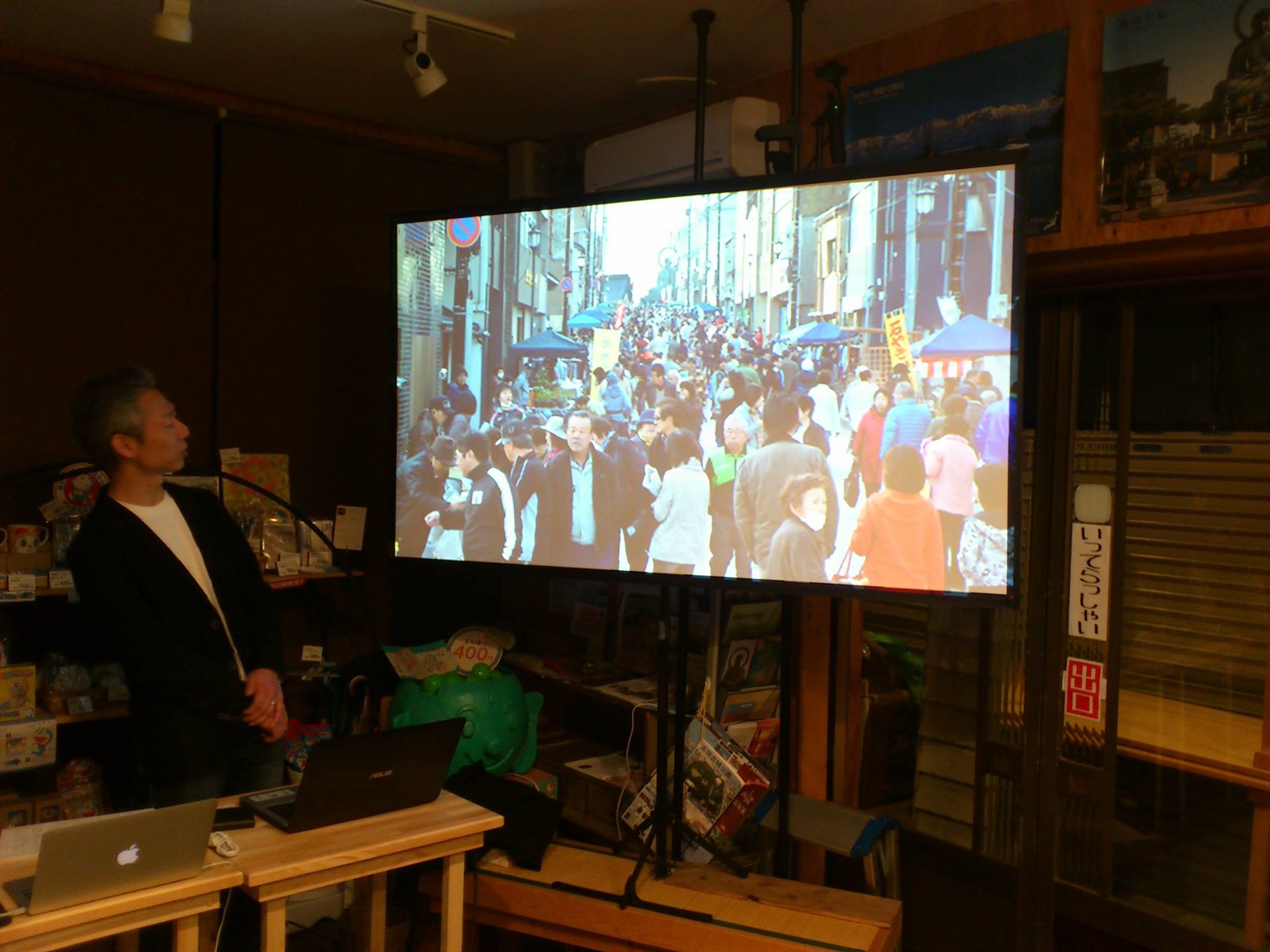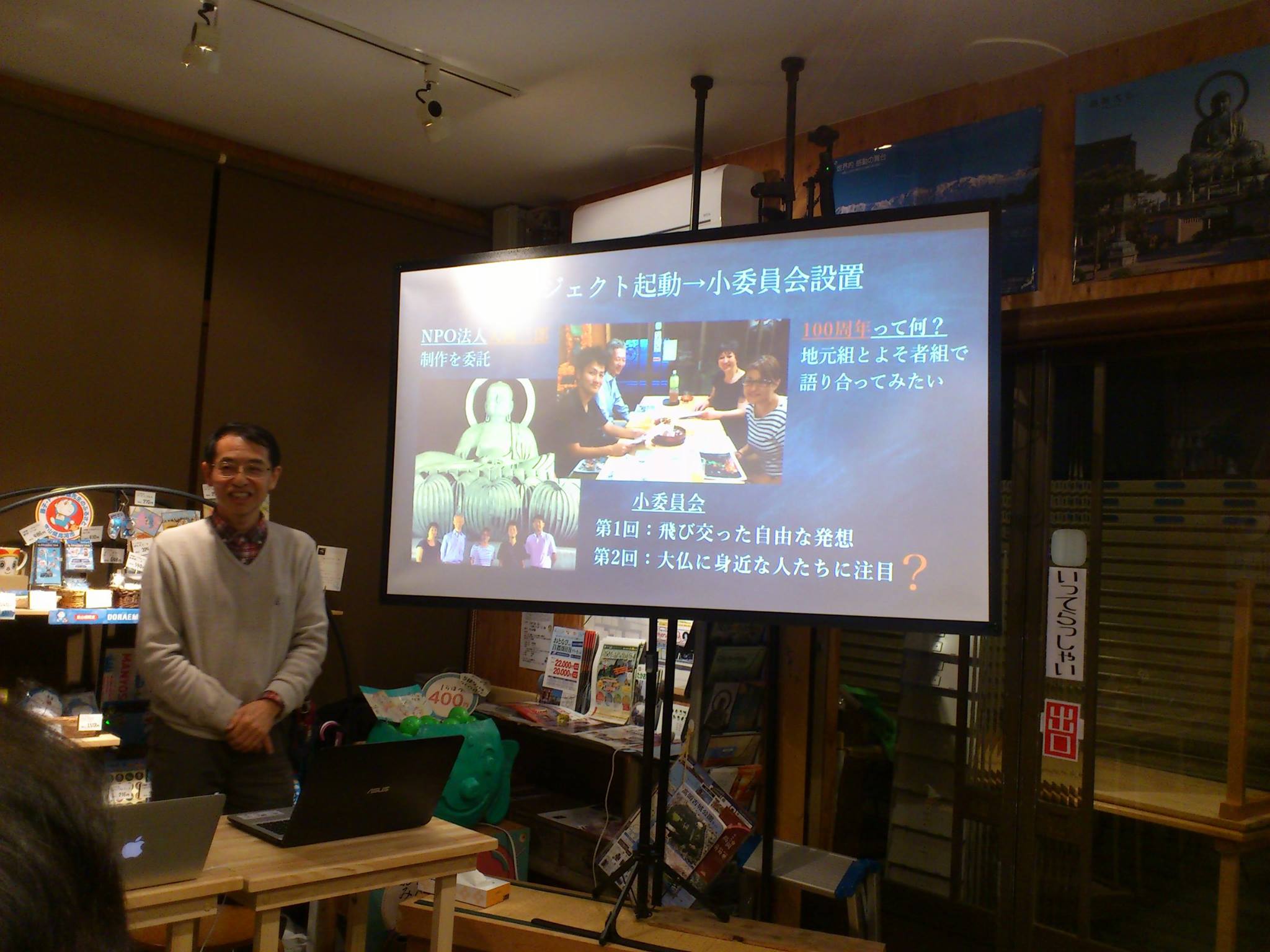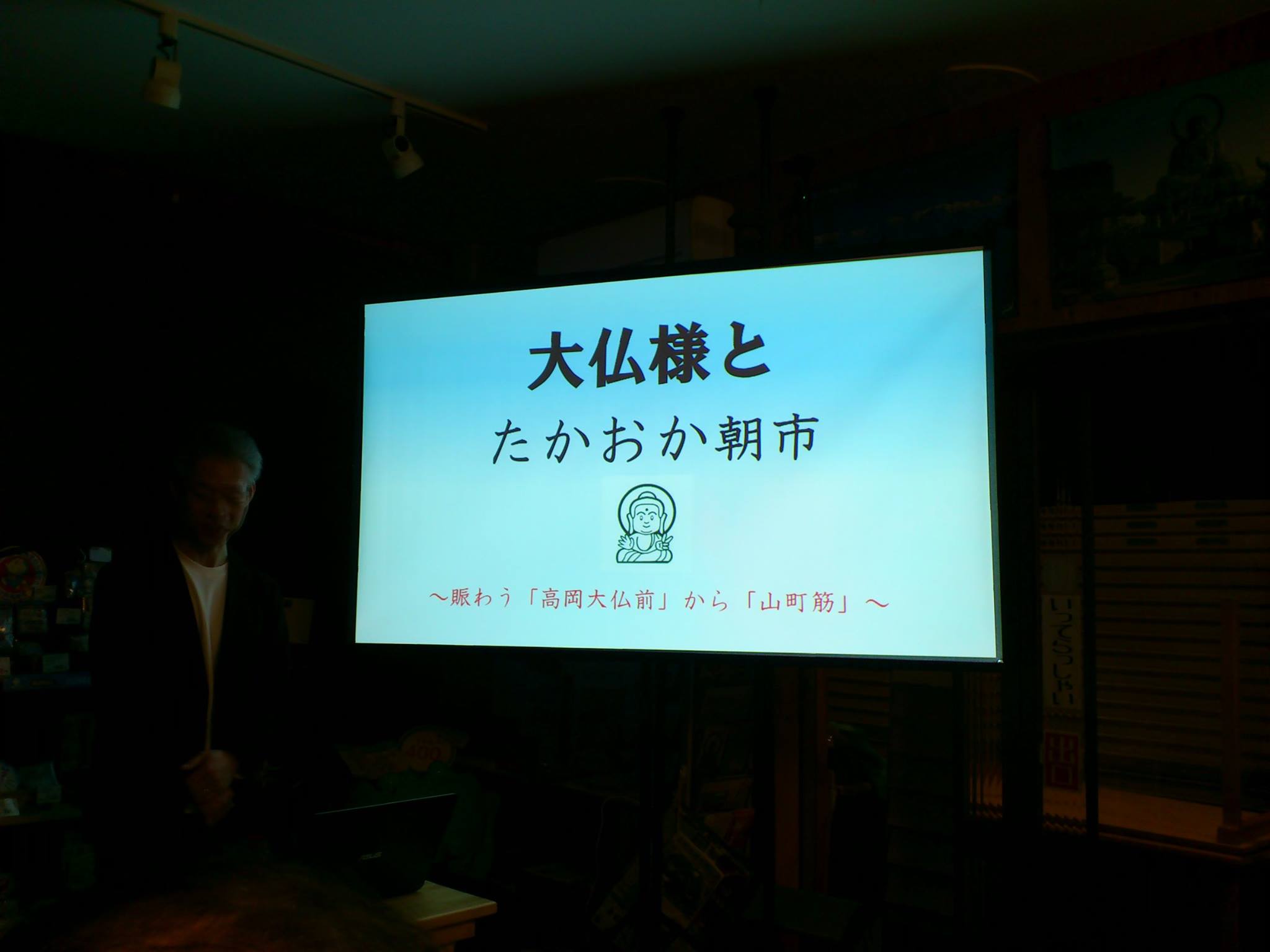 たかおか朝市実行委員会の松本光司さんによるプレゼン『大仏様とたかおか朝市』と意見交換、