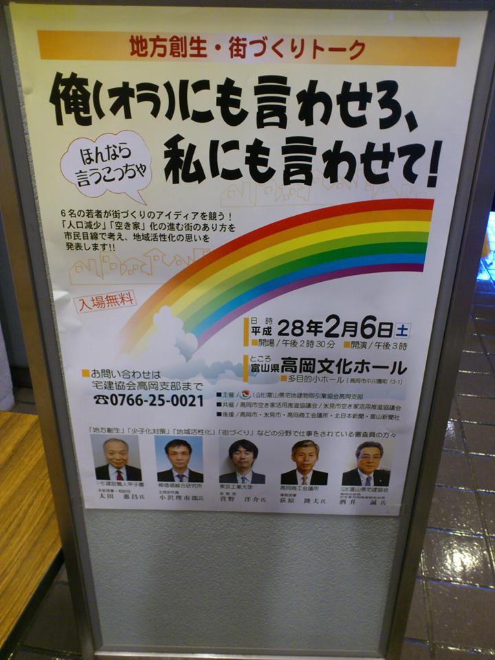 イベント参加報告 2016/02/15 【イベント参加報告】地方創生・街づくりトーク「俺(オラ)にも言わせろ、私にも言わせて!」(2/6) 街づくりの意見や提案を発表(高岡ケーブルネットワーク)2月6日(土)、高岡文化ホールで「地方創生・街づくりトーク 俺(オラ)にも言わせろ、私にも言わせて!」が開催されました。人口減少・空き家化の進むまちの未来を、6人の若者がそれぞれのアイデアで語りました。富山大学芸術文化学部生が最優秀賞に選ばれた他、様々な若いアイデアに大きな刺激を受けました。 PR http://kirittotakaoka.ria10.com/houkoku/201602151900【イベント参加報告】地方創生・街づくりトーク「俺(オラ)にも言わせろ、私にも言わせて!」(2/6)