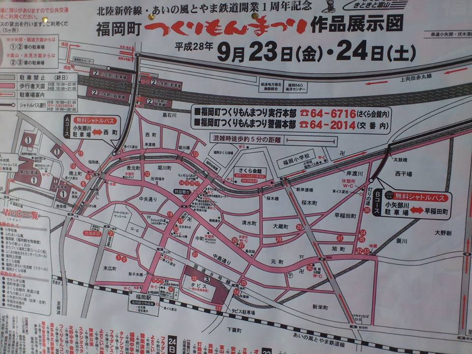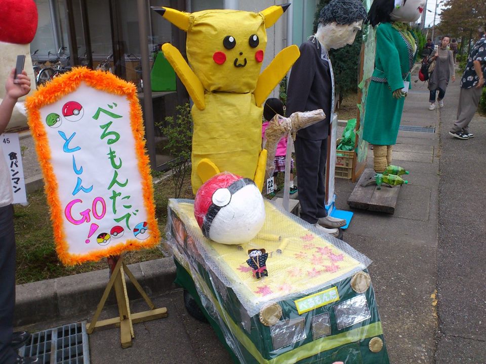 イベント参加報告 2016/09/28 【イベント参加報告】福岡町つくりもんまつり 全36作品紹介(1)~(10) 9月24日(土)。午前は「金屋町楽市 in さまのこ」に、昼から「第33回 中田かかし祭」に足を運びました。夕方からは、「福岡町つくりもんまつり」へ。今年は36作品が福岡町中心市街地各所に展示。もちろん、今年も全作品を歩いて巡りました。作品は1箇所ではなく色んな場所に点在しているため、全作品を見るには結構な時間がかかります。というわけで、当ブログで全作品を紹介したいと思います。数が多いので、4回に分けます。今回はまず、(1)~(10)の作品です。(1)鬼たいじ(次勝作品)製作者:爆笑会とゆかいな仲間たち展示場所:中島宅前 空き地(2)菜獣戯画製作者:鳥取大学展示場所:中島宅前 空き地常連となりました、鳥取大学の作品です。(3)福岡町へポケモンGO製作者:富山銀行福岡支店展示場所:福岡駅前今年の流行です。(4)機関車トーマス製作者:西日本鉄道OB会 高岡支部福岡分会展示場所:福岡駅前小さい頃、きかんしゃトーマスが苦手だったことを思い出しました。(5)福岡「野猿公苑」製作者:西日本鉄道OB会 高岡支部福岡分会展示場所:福岡駅前(6)末広蘭綾王(優勝作品)製作者:末広町自治会展示場所:福岡にぎわい交流館名物・巨大作品です。今年福岡駅前にオープンしました、福岡にぎわい交流館「フクール」での展示でした。(7)高岡信用金庫福岡支店製作者:高岡信用金庫福岡支店展示場所:高岡信用金庫福岡支店作品名・製作者・展示場所が全く同じというレアなパターン。(8)花電車(次勝作品)製作者:橋上町自治会展示場所:中田建設駐車場(9)橋上っ子といっしょにおどろう!製作者:橋上町児童クラブ展示場所:橋上町交差点(10)日本三景と松島と五大塔(次勝作品)製作者:橋上町寿会展示場所:稲毛畳店車庫 PR http://kirittotakaoka.ria10.com/houkoku/201609280000【イベント参加報告】福岡町つくりもんまつり 全36作品紹介(1)~(10)