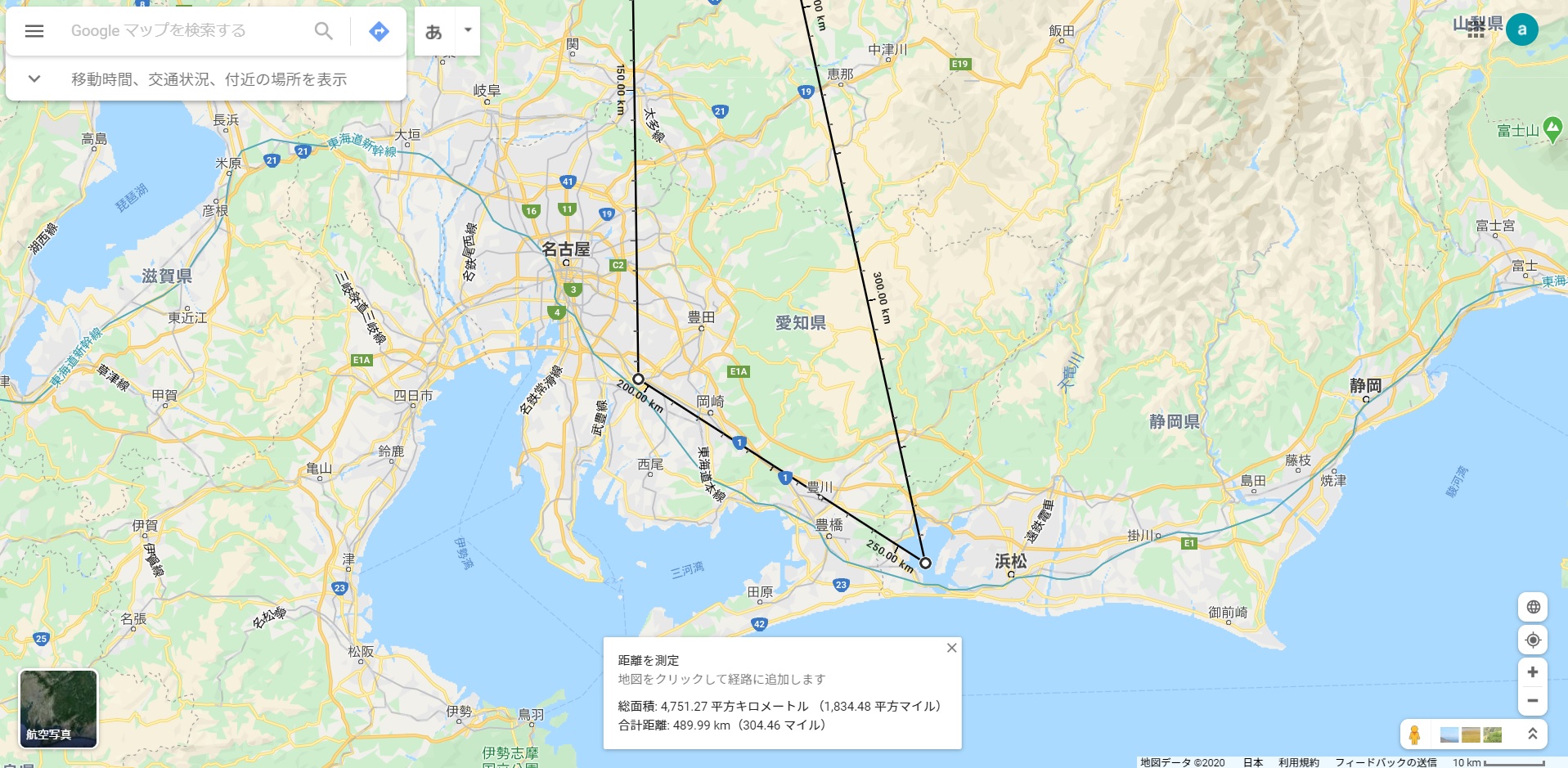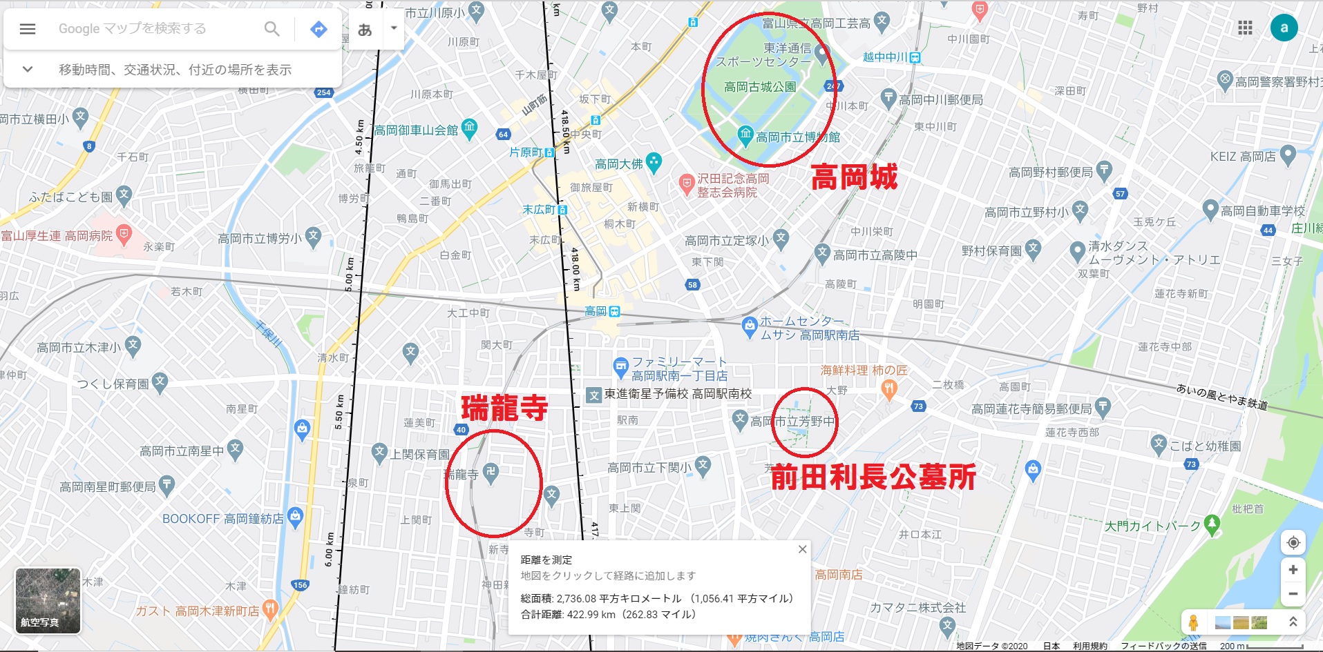 観光・イベント情報 2020/08/13 瑞龍寺前の「気になるあの看板」について、検証してみた こちらは、高岡でも特に有名な史跡、国宝瑞龍寺。高岡開町の祖・前田利長公の菩提寺です。その門前に、こんな看板があるのはご存知でしょうか。 (2014年撮影したものなので、現在は看板の場所が変わっています)瑞龍寺の約870m(八丁)東に位置する「前田利長公墓所」を説明する看板ですが、この看板をよく見ると・・・。 (この写真は先日撮影したもので、看板も現在の位置にあります)とても興味深いことが書いてあります。かつて利長も城主を務めた、二上山の「守山城」と、「瑞龍寺」「利長公墓所」をそれぞれ直線で結ぶと、直角三角形になると。また、「守山城」と「利長公墓所」を結ぶ直線上に、「高岡城」があると。そして、それぞれの直線を更に延ばすと、利家・利長が生まれた「荒子」(現在の名古屋市中川区)、徳川家康の「岡崎城」(愛知県岡崎市)に至るという。学生の頃から気になっていたこの看板。せっかくなので、「Googleマップに直線を引く」という素人的なやり方で、検証してみましたwまずは、「守山城」「荒子城」「岡崎城」を結ぶ三角形を作り、「瑞龍寺」「利長公墓所」「高岡城」がその辺上に位置するかどうかの検証です。(以下の画像は、Googleマップより)はい、作りました。それぞれの頂点を拡大します。こちらは「守山城」です。こちらは利家・利長の生誕地「荒子城」。現在は冨士権現天満宮というお宮さんがあります。実は2018年12月に私も訪れました。そして、徳川家康の「岡崎城」。日本百名城にも選ばれています。さて、いよいよこの三角形で、高岡市街地を見てみると・・・・。あああああああ残念・・・・。結構ずれていますね・・・。さすがに正確な日本地図もない時代。これくらいの誤差は出てしまいました。でも、「誤差の範囲」でしょうね。となると、もうひとつ検証しなければいけなくなりました。今度は、こんな三角形を作りました。そう、今度は「守山城」と「瑞龍寺」「利長公墓所」を結んだ線が、どこに至るかの検証です。その前に・・・。この地図を見ていただければわかる通り、「守山城」「利長公墓所」を結ぶ線上に、「高岡城」がありますね!これは間違いありませんでした。さて、だいぶ適当に作図しましたが、愛知県側を見てみると・・・。まず、「高岡城・利長公墓所」側の延長線上は、なんと「浜名湖」に至りましたwうなぎ食べたいですね・・・。一方、「瑞龍寺」側の延長線上は・・・愛知県の長久手、知立、西尾あたりに至ることがわかりました。(画像の地図では、知立市中心部まで結んであります)あくまで、素人発想ですので、専門的な検証ではないことをご了承ください・・・。こういう検証の結果ではちょっと誤差がありましたが、やはり「そういう思いを持って作られた(と思われる)」というストーリーが何よりも大事で、それが正確かどうかは正直どうでもいいのかもしれません。というわけで、このブログは、あくまで「ひとつのトリビア」として読んでいただけたらと思いますw http://kirittotakaoka.ria10.com/kankou/202008131300瑞龍寺前の「気になるあの看板」について、検証してみた
