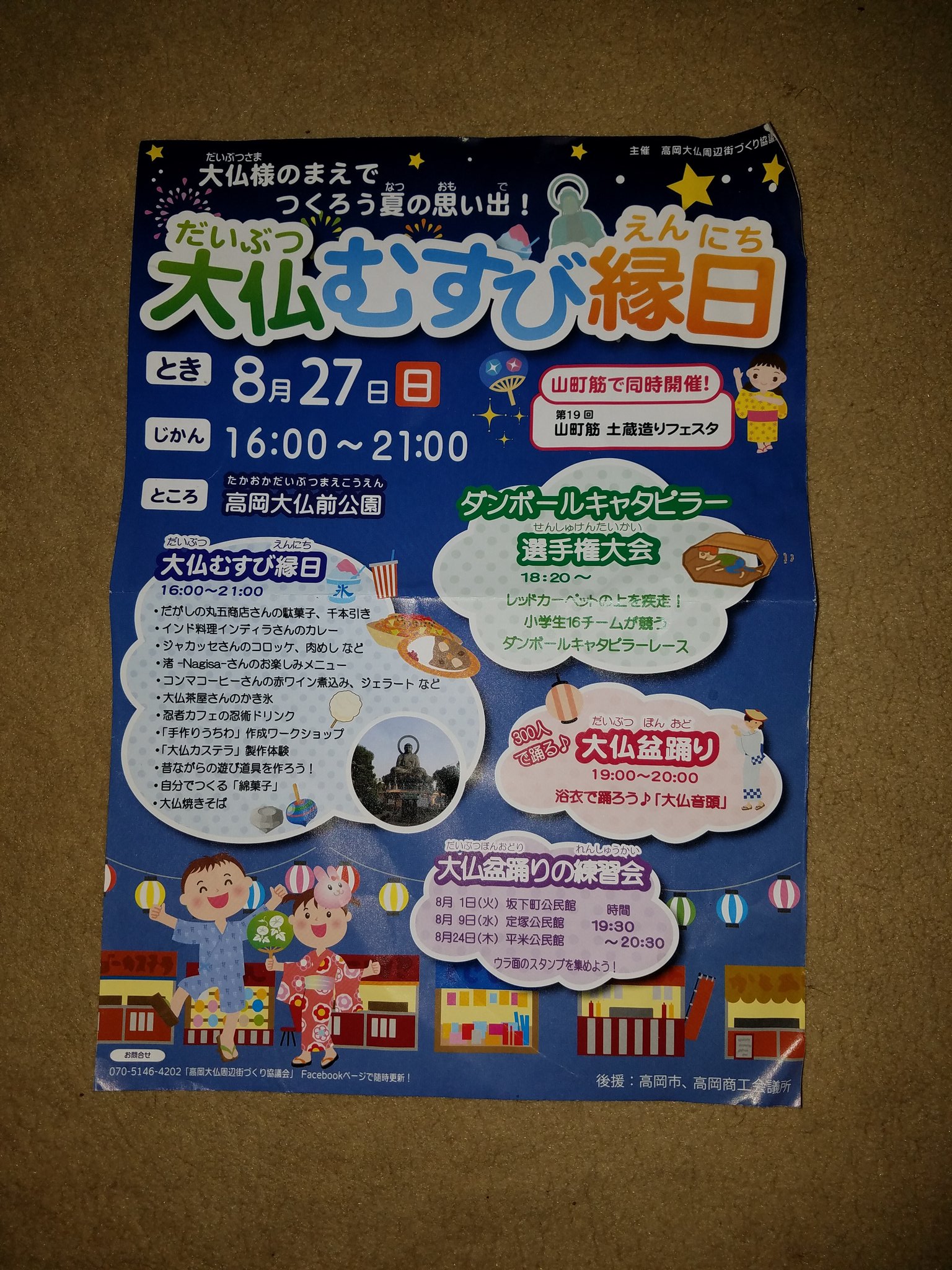 観光・イベント情報 2017/08/11 【イベント情報】大仏むすび縁日(8/27) 8月27日(日)。今年も、高岡大仏前にて、「大仏むすび縁日」が開催されます。夏の終わりに・・・大仏様の前の縁日で、思い出を作りませんか?縁日には、今年も特定非営利活動法人大佛三郎の「大仏カステラ焼き体験」が出店いたします!他にも様々なお店が並びますので、ぜひ足を運んでみてください!そして、昨年のむすび縁日で、約20年ぶりに復活した「大仏音頭」の輪踊り。今年は更にパワーアップし、「300人で踊る♪大仏盆踊り」を目指しております!!みんなで盆踊りを踊りましょう♪踊りに自信のない方は、練習会もあります!練習会はあと1回、8月24日(木)19時半より平米公民館で開催されますので、ぜひ参加してみてください!(8月9日に定塚公民館で開催された練習会の様子)内容盛りだくさんの大仏むすび縁日。多くのご参加、待っとっちゃ(^^)/大仏むすび縁日日時:2017年8月27日(日)16時00分~21時00分場所:高岡大仏前公園開催イベント~大仏むすび縁日~・だがしの丸五商店さんの駄菓子、千本引き・インド料理インディラさんのカレー・ジャカッセさんのコロッケ、肉めしなど・渚 -Nagisa-さんのお楽しみメニュー・コンマコーヒーさんの赤ワイン煮込み、ジェラートなど・大仏茶屋さんのかき氷・忍者カフェの忍術ドリンク・「手づくりうちわ」作成ワークショップ・「大仏カステラ」製作体験・昔ながらの遊び道具を作ろう!・自分でつくる「綿菓子」・大仏焼きそば~ダンボールキャタピラー選手権大会~時間:18時20分~レッドカーペットの上を疾走!小学生16チームが競うダンボールキャタピラーレース~300人で踊る♪大仏盆踊り~時間:19時00分~20時00分浴衣で踊ろう♪「大仏音頭」 大仏盆踊りの練習会 8月1日(火)坂下町公民館 (終了) 8月9日(水)定塚公民館 (終了) 8月24日(木)平米公民館 時間:いずれも19時30分~20時30分 PR http://kirittotakaoka.ria10.com/kankou/201708112000【イベント情報】大仏むすび縁日(8/27)