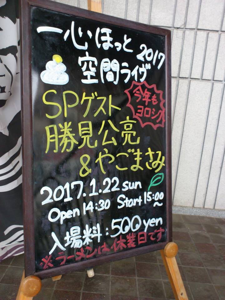 管理人のつぶやきその他 2017/01/23 【イベント参加報告・富山市】一心ほっと空間ライヴ2017 1月号(1/22) 1月22日(日)、富山市のラーメン一心丸の内店にて、「一心ほっと空間ライヴ2017 1月号」が開催されました。本年も、パシリを仰せつかりました。そして、3ヶ月ぶりに看板を書かせていただきました。まずは主催のシンガーソングライター・CHIHHIEさんのステージ。今回はその中で新曲2曲を披露しました。また、今回は糸魚川からミュージシャンの方々がお越しくださいました。CHIHHIEさんとのコラボがあった他、ライヴ終了後に糸魚川復興支援の缶バッジ販売が行われました。今回のスペシャルゲストは、北陸を中心に活躍する「勝見公亮&やごまさみ」のお二人。それぞれソロでも大活躍のシンガーさん。そんなお二人のユニットだなんて贅沢です!本当に素晴らしい歌声でした。なお、当日、CHIHHIEさんにチューリップテレビさんの取材が来ておりました。1月25日(水)18時15分から放送の「ニュース6」で取り上げられるということです。 PR http://kirittotakaoka.ria10.com/kanrinin/201701232200【イベント参加報告・富山市】一心ほっと空間ライヴ2017 1月号(1/22)