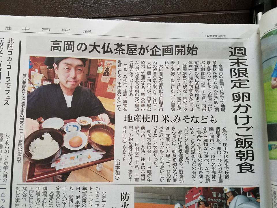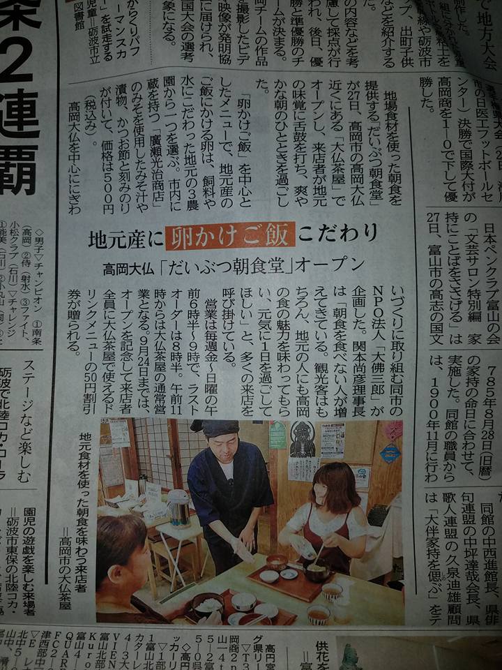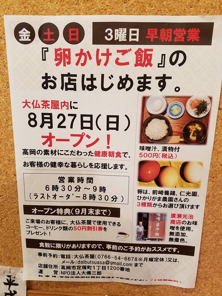 NPO法人 大佛三郎 2017/08/31 大仏茶屋の卵かけご飯朝食営業「だいぶつ朝食堂」がオープンしました!(8/27) 8月27日(日)。大仏茶屋の卵かけご飯朝食営業「だいぶつ朝食堂」がオープンいたしました。オープン初日は「たかおか朝市」の開催日とも重なり、多くのお客様にご来店いただきました。(8月28日 北陸中日新聞) (8月28日 富山新聞)高岡の食材にこだわった「卵かけご飯」。今後は、毎週金・土・日、朝6時30分~9時(ラストオーダー8時30分)の営業となります。皆様のご来店、お待ちしております!大仏茶屋の地図(Googleマップ) PR http://kirittotakaoka.ria10.com/saburou/201708310800大仏茶屋の卵かけご飯朝食営業「だいぶつ朝食堂」がオープンしました!(8/27)