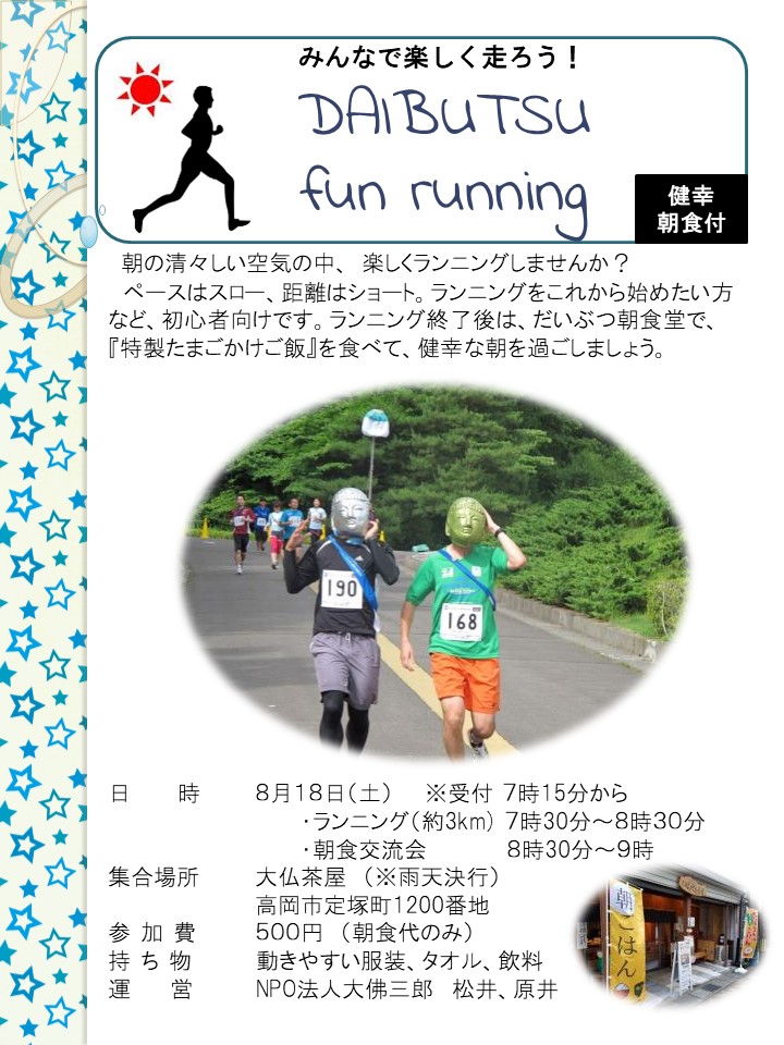 NPO法人 大佛三郎 2018/08/15 【イベント情報】しあプロ★大仏ラン(8/18) ★詳しい情報はこちら★しあプロ★大仏ラン(Facebookイベントページ)朝の清々しい空気の中、 楽しくランニングしませんか?ペースはスロー、距離はショート。ランニングをこれから始めたい方など、初心者向けです。ランニング終了後は、だいぶつ朝食堂で、『特製たまごかけご飯』を食べて、健幸な朝を過ごしましょう。しあプロ★大仏ラン【日時】2018年8月18日(土)※受付 7時15分から・ランニング(約3km) 7時30分~8時30分・朝食交流会 8時30分~9時【集合場所】大仏茶屋(※雨天決行)高岡市定塚町1200番地【参加費】500円(朝食代のみ)【持ち物】動きやすい服装、タオル、飲料【運営】NPO法人大佛三郎 松井、原井 PR http://kirittotakaoka.ria10.com/saburou/201808152100【イベント情報】しあプロ★大仏ラン(8/18)