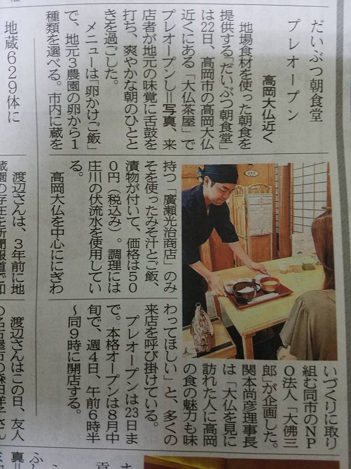 NPO法人 大佛三郎 2017/07/25 【イベント参加報告】だいぶつ朝食堂 プレオープン(7/22・23) (7月23日 富山新聞)高岡大仏の目のまえで地産の健康朝食を(高岡市ホームページ)7月22日(土)23日(日)、たかおか大仏茶屋にて「だいぶつ朝食堂」をプレオープンいたしました。提供させていただくのは、高岡の食材を使用したこだわりの卵かけご飯(500円)。卵は、高岡の3養鶏場さんの卵から、お好きなものを選んでいただく形です。・米寿の卵(仁光園さん)・きらめき美人(前崎養鶏さん)・越中名水赤卵(ひかりがま農園さん)お米は高岡産コシヒカリを使用。醤油と、味噌汁のお味噌は高岡の広瀬光治商店さんのものを使用しております。手探り状態でようやくプレオープンを迎える運びとなりました。朝早く、日曜日は特に天候も悪い中、たくさんの方にご予約・ご来店いただき、本当にありがとうございました。本オープンは、8月中に迎えられればと思っております。 http://kirittotakaoka.ria10.com/saburou/201707251200【イベント参加報告】だいぶつ朝食堂 プレオープン(7/22・23)