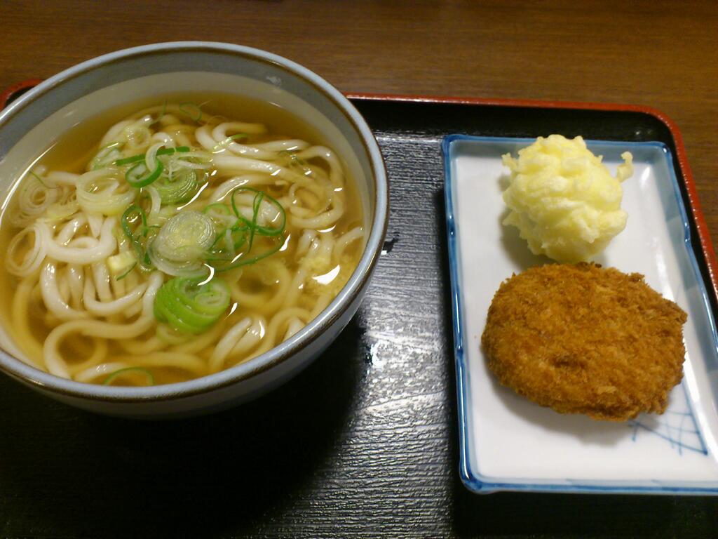 かけうどん並に、揚げ卵と、高岡コロッケをプラスしても400円とは・・・。