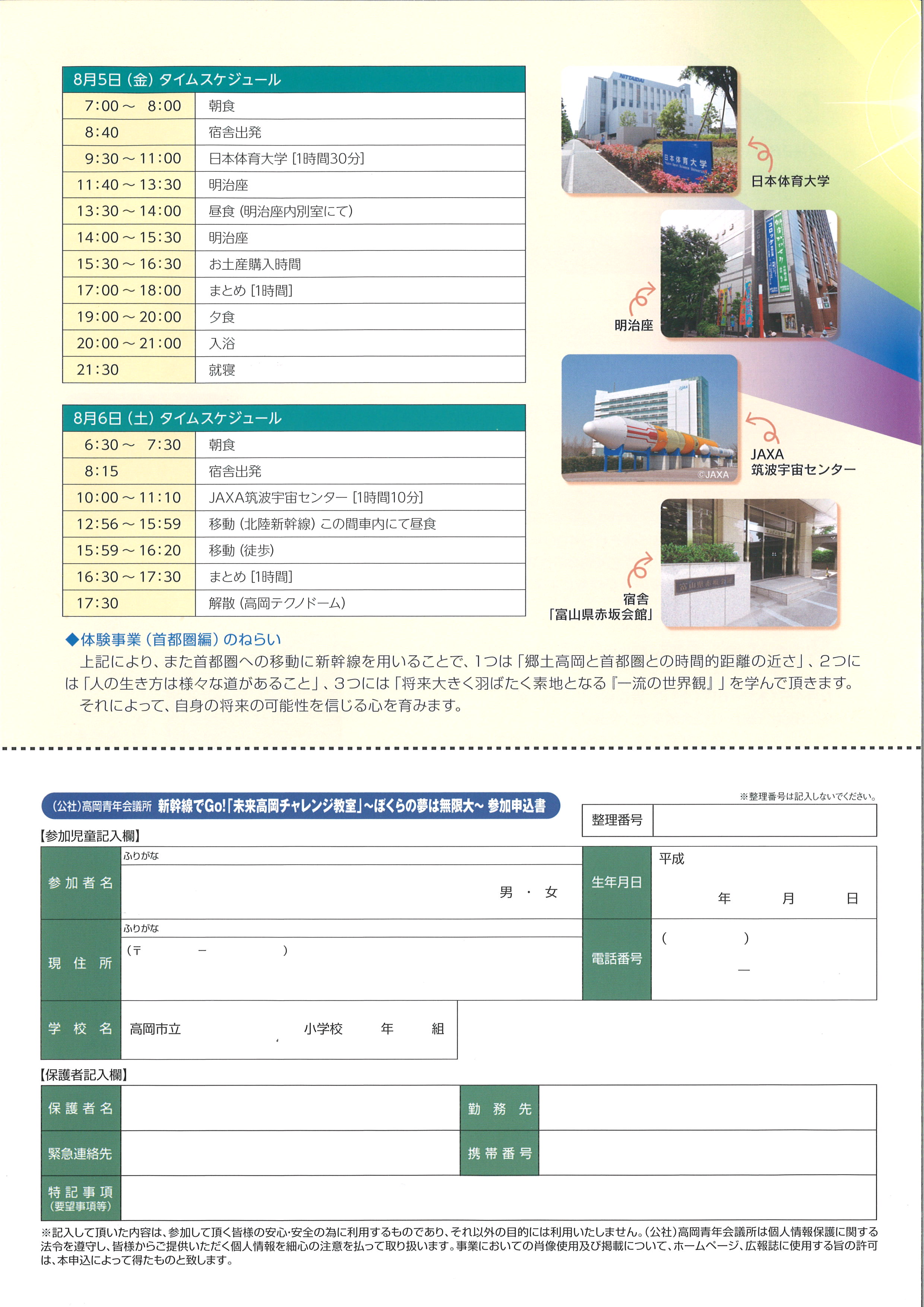 (公社)高岡青年会議所 2016/06/07 小学生対象体験事業『新幹線でGo!「未来高岡かがやき教室」 ~ぼくらの夢は無限大~』(7/26・8/4~6) 青少年育成事業『新幹線でGo!「未来高岡かがやき教室」~ぼくらの夢は無限大~』開催のご案内(高岡青年会議所ホームページ)本年度賛助会員として所属しております、2016年度(公社)高岡青年会議所 次世代育成実践委員会で、高岡の「みらいづくり」に取り組んでおります。これまで、高校生に対する有権者教育、親世代に対する講演会を行ってきましたが、もうひとつ、小学生を対象とした体験事業に取り組みます。ぜひ、ご参加をお待ちしております!!新幹線でGo!「未来高岡かがやき教室」 ~ぼくらの夢は無限大~募集人数:40名募集学年:高岡市内の小学5年生・6年生募集締め切り:2016年6月30日(火)必着応募資格:事業全てに参加できる方 健康状態が良好で、規律に従い団体行動が出来る方参加決定:応募者多数の場合は、厳正なる抽選により参加者を決定致します(キャンセル等が出た場合、2次募集有り)。尚、参加決定は郵送にて通知致しますが、参加費の振り込みをもって最終決定とします。申し込み方法:(公社)高岡青年会議所事務局へ郵送・持参・FAX主催:2016年度(公社)高岡青年会議所 担当・次世代育成実践委員会後援:高岡市、高岡市教育委員会~事業の詳細~オリエンテーション日時:2016年7月21日(水)19時~20時場所:高岡商工ビル802・803会議室スケジュール18時30分~19時 ・・・受付・登録19時~19時5分 ・・・開会、理事長挨拶19時5分~19時10分 ・・・スタッフ紹介19時10分~19時20分 ・・・事業の趣旨説明19時20分~19時30分 ・・・事業の内容説明19時30分~19時45分 ・・・安全対策、注意事項19時45分~19時55分 ・・・質疑応答19時55分~20時 ・・・事務連絡20時 ・・・閉会体験事業(高岡編)日時:2016年7月26日(火)8時~16時30分スケジュール7時30分~8時 ・・・受付・登録8時30分~9時50分 ・・・高岡市デザイン・工芸センター、富山県総合デザインセンター(1時間20分)10時40分~12時 ・・・三芝硝材㈱(1時間20分)12時20分~13時 ・・・道の駅万葉の里高岡 昼食13時15分~14時35分 ・・・BBSジャパン㈱(1時間20分)15時10分~16時30分 ・・・まとめ16時30分 ・・・解散(高岡商工ビル)体験事業(首都圏編)日時:2016年8月4日(木)~8月6日(土)宿泊地:富山県赤坂会館スケジュール8月4日(木)6時40分~7時10分 ・・・受付・登録7時22分~9時44分 ・・・移動(北陸新幹線「かがやき」)10時30分~11時30分 ・・・国会議事堂(参議院)(1時間)11時45分~12時45分 ・・・参議院議員会館内会議室(昼食)(1時間)13時~14時30分 ・・・文部科学大臣政務官室、情報ひろば(1時間30分)14時50分~16時30分 ・・・遊就館(1時間40分)17時~18時 ・・・まとめ(1時間)19時~20時 ・・・昼食20時~21時 ・・・入浴21時30分 ・・・就寝8月5日(金)7時~8時 ・・・朝食8時40分 ・・・宿舎出発9時30分~11時 ・・・日本体育大学(1時間30分)11時40分~13時30分 ・・・明治座13時30分~14時 ・・・昼食(明治座内別室にて)15時30分~16時30分 ・・・お土産購入時間17時~18時 ・・・まとめ(1時間)19時~20時 ・・・昼食20時~21時 ・・・入浴21時30分 ・・・就寝8月6日(土)6時30分~7時30分 ・・・朝食8時15分 ・・・宿舎出発10時~11時10分 ・・・JAXA筑波宇宙センター(1時間10分)12時56分~15時59分 ・・・移動(北陸新幹線)この間車内にて昼食15時59分~16時20分 ・・・移動(徒歩)16時30分~17時30分 ・・・まとめ(1時間)17時30分 ・・・解散(高岡テクノドーム) PR http://kirittotakaoka.ria10.com/takaokajc/201606071900小学生対象体験事業『新幹線でGo!「未来高岡かがやき教室」 ~ぼくらの夢は無限大~』(7/26・8/4~6)