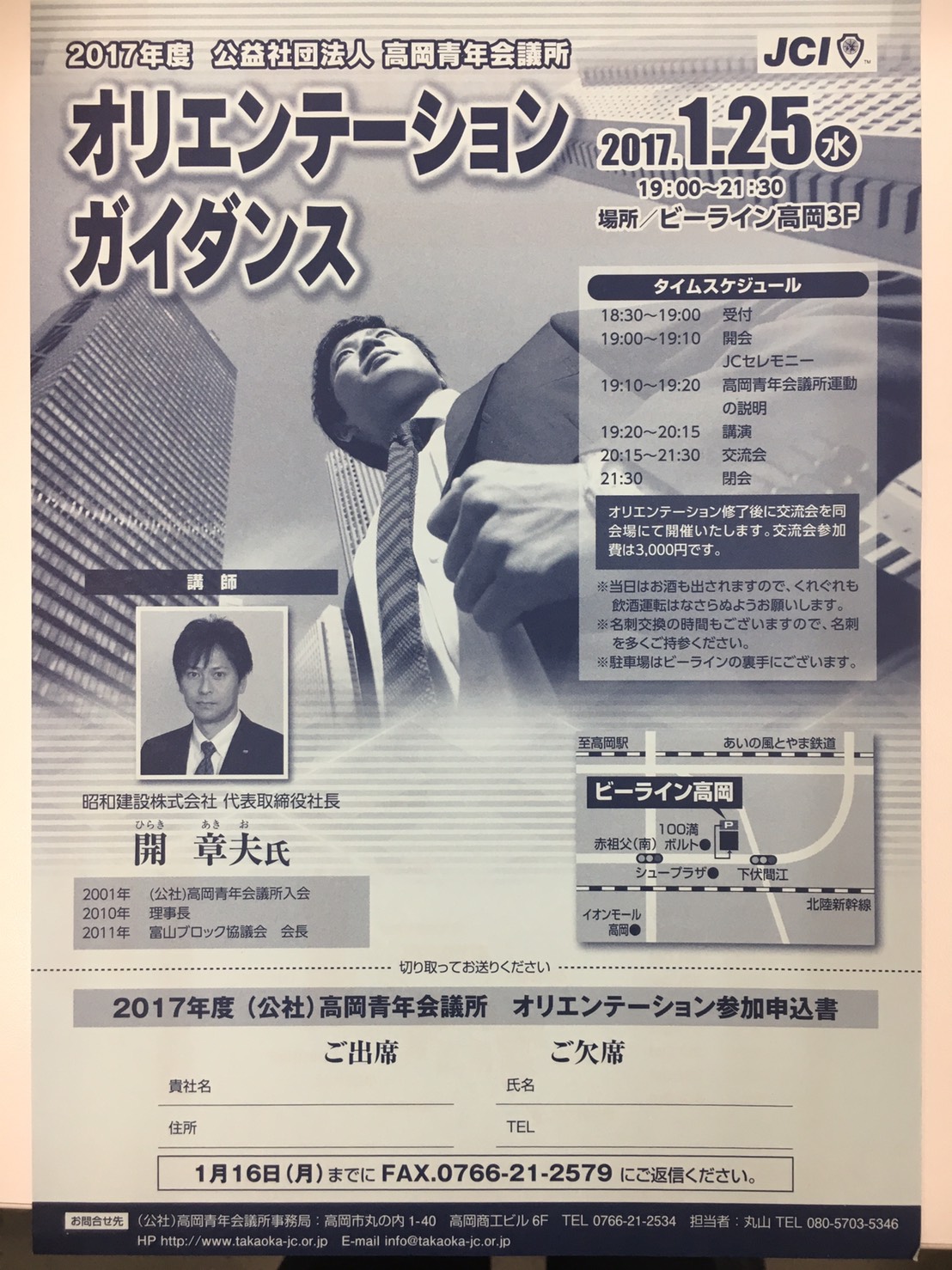 (公社)高岡青年会議所 2017/01/23 【イベント情報】2017年度(公社)高岡青年会議所 オリエンテーションガイダンス(1/25) ★詳しい情報はこちら★【1月25日開催】オリエンテーションガイダンス(高岡青年会議所ホームページ)2017年度(公社)高岡青年会議所ホームページ(外部リンク)(公社)高岡青年会議所のオリエンテーション・ガイダンスを、1月25日(水)に開催いたします。当日は高岡青年会議所の卒業生・開章夫氏(昭和建設株式会社 代表取締役社長)の講演、交流会などを通し、高岡青年会議所の魅力を知っていただく機会になればなと思います。高岡の20歳~40歳の皆様、ぜひ一緒に高岡青年会議所で活動しませんか?お気軽にご参加ください。2017年度 公益社団法人 高岡青年会議所 オリエンテーション・ガイダンス日時:2017年1月25日(水)19時~21時30分場所:ビーライン高岡3Fタイムスケジュール18時30分~19時 受付19時~19時10分 開会 JCセレモニー19時10分~19時20分 高岡青年会議所運動の説明19時20分~20時15分 講演20時15分~21時30分 交流会(参加費:3,000円)21時30分 閉会講師紹介開 章夫 氏(昭和建設株式会社 代表取締役社長) 2001年 (公社)高岡青年会議所入会 2010年 (公社)高岡青年会議所 第40代理事長 2011年 (公社)日本青年会議所北陸信越地区富山ブロック協議会 会長※オリエンテーション終了後に交流会を同会場にて開催いたします。交流会参加費は3,000円です。※当日はお酒も出されますので、くれぐれも飲酒運転はなさらぬようお願いします。※名刺交換の時間もございますので、名刺を多くご持参ください。※駐車場はビーラインの裏手にございます。 PR http://kirittotakaoka.ria10.com/takaokajc/201701231600【イベント情報】2017年度(公社)高岡青年会議所 オリエンテーションガイダンス(1/25)