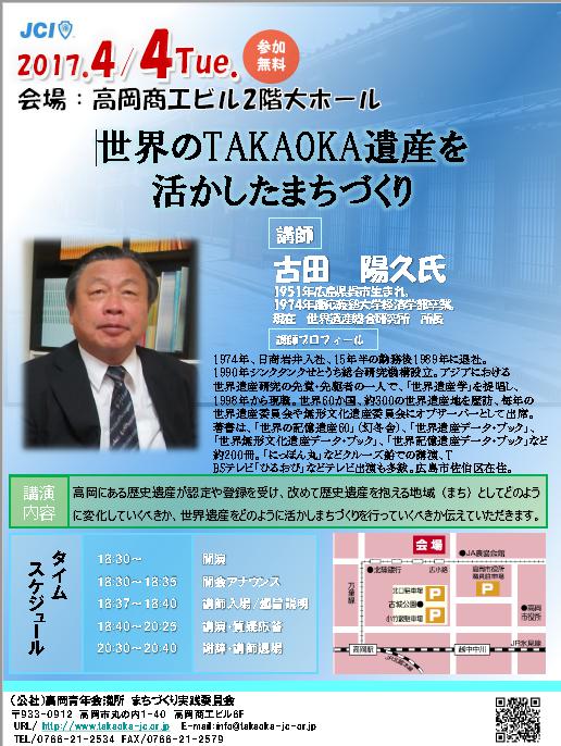 (公社)高岡青年会議所 2017/03/17 【イベント情報】(公社)高岡青年会議所 4月度オープン例会世界のTAKAOKA遺産を活かしたまちづくり」 (4/4) 【4月度オープン例会】「世界のTAKAOKA遺産を活かしたまちづくり」 (高岡青年会議所ホームページ)(公社)高岡青年会議所 4月度オープン例会のお知らせです。今回の例会は、私が所属しております「まちづくり実践委員会」が担当の、地域(まち)づくりがテーマの講演となります。世界遺産総合研究所・所長の古田陽久先生をお招きし、「世界のTAKAOKA遺産を活かしたまちづくり」と題した講演会を開催いたします。日本遺産、高岡御車山祭のユネスコ無形文化遺産認定など、高岡の歴史遺産はますます注目を集めています。そういった「TAKAOKA遺産」をどのように活かし、まちづくりを行っていくべきか。世界遺産のプロである古田先生に、語っていただきます。参加無料となっておりますので、お時間のある方はぜひご参加ください!!(公社)高岡青年会議所 4月度オープン例会「世界のTAKAOKA遺産を活かしたまちづくり」日時:2017年4月4日(火)18時30分~場所:高岡商工ビル 2階大ホール(高岡市丸の内1-40)参加費:無料講師:古田 陽久 氏1951年 広島県呉市生まれ1974年 慶應義塾大学経済学部卒業現在 世界遺産総合研究所 所長~講師プロフィール~1974年、日商岩井入社、15年半の勤務後1989年に退社。1990年シンクタンクせとうち総合研究機構設立。アジアにおける世界遺産研究の先覚・先駆者の一人で、「世界遺産学」を提唱し、1998年から現職。世界60か国、約300の世界遺産地を歴訪、毎年の世界遺産委員会や無形文化遺産委員会にオブザーバーとして出席。著書は、『世界の記憶遺産60』(幻冬舎)、『世界遺産データ・ブック』、『世界無形文化遺産データ・ブック』、『世界記憶遺産データ・ブック』など約200冊。「にっぽん丸」などクルーズ船での講演、TBSテレビ「ひるおび!」などテレビ出演も多数。広島市佐伯区在住。講演内容:高岡にある歴史遺産が認定や登録を受け、改めて歴史遺産を抱える地域(まち)としてどのように変化していくべきか、世界遺産をどのように活かしまちづくりを行っていくべきか伝えていただきます。 PR http://kirittotakaoka.ria10.com/takaokajc/201703172200【イベント情報】(公社)高岡青年会議所 4月度オープン例会世界のTAKAOKA遺産を活かしたまちづくり」 (4/4)