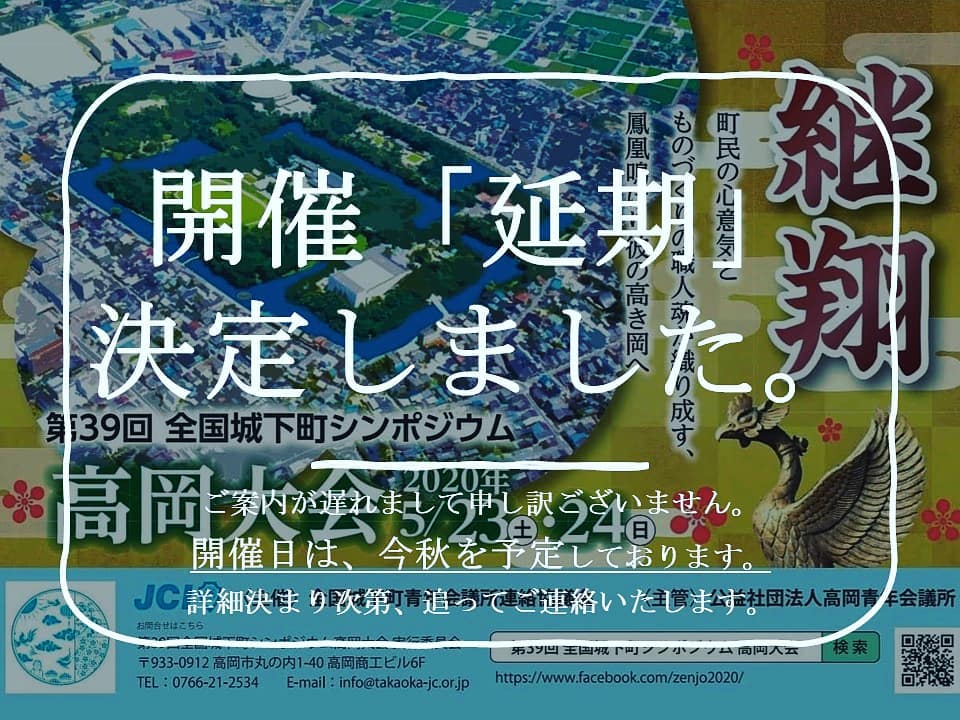 (公社)高岡青年会議所 2020/05/22 明日から「第39回全国城下町シンポジウム高岡大会」のはずだった・・・ 第39回 全国城下町シンポジウム高岡大会 公式ホームページ(外部リンク)新型コロナウイルスがなければ、明日から2日間「第39回 全国城下町シンポジウム高岡大会」が開催されるはずでした。全国城下町青年会議所連絡協議会主催で、年1回開催されているシンポジウム。今年は2003年以来2度目の高岡開催。高岡青年会議所にとっても創立50周年という記念すべき年だったので、2020年に対する思いはとても強かったはず・・・。私は一賛助会員で、この大会に関してもそこまで重要な立ち位置ではありませんが・・・。昨年の豊橋大会に足を運んだ際、「来年はこの大会が高岡で行われるのか!」と思ったのは今でも忘れられません。それがまさかこんな事態になるとは・・・。普段通りの日常を送っていた人にとっても、特別な年になるはずだった人にとっても、とてもつらい2020年となってしまいました。「第39回 全国城下町シンポジウム高岡大会」は、今秋への延期の予定。秋にはこの状況がどうなっているかわかりませんが・・・。無事に開催されることをお祈りいたします。 http://kirittotakaoka.ria10.com/takaokajc/202005222300明日から「第39回全国城下町シンポジウム高岡大会」のはずだった・・・