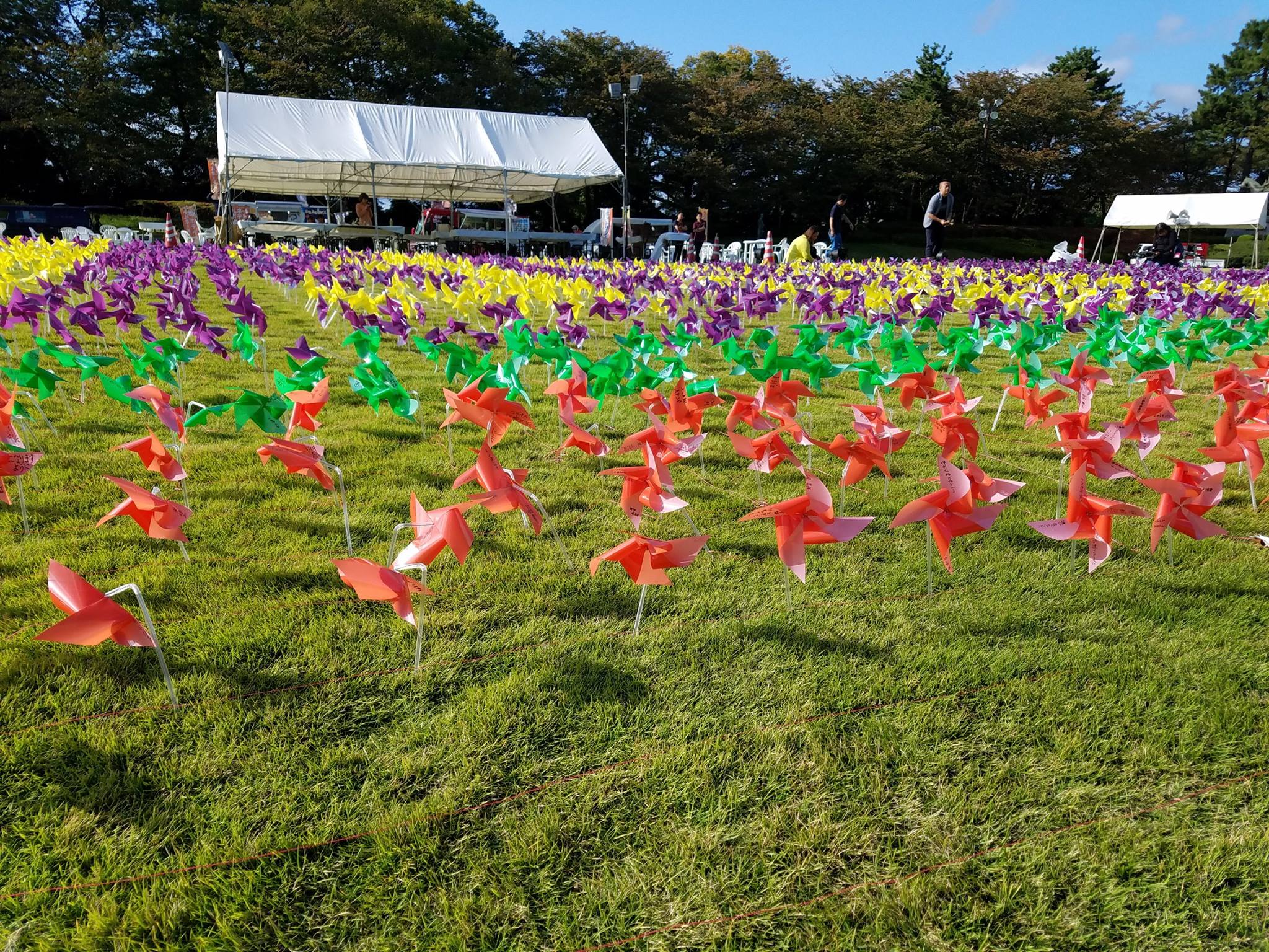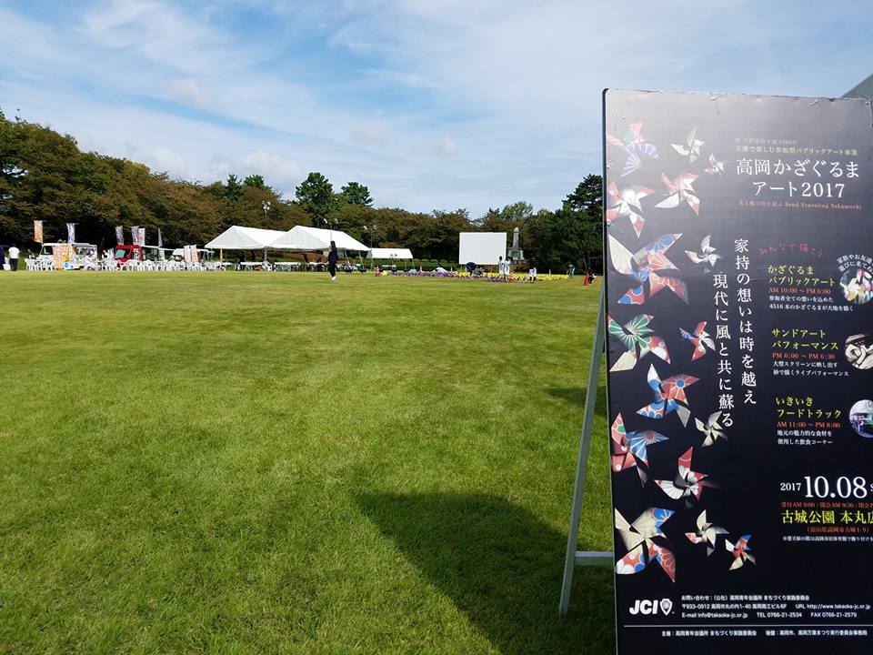 (公社)高岡青年会議所 2017/10/17 【イベント参加報告】高岡かざぐるまアート2017(10/8) 第37回 高岡万葉まつり最終日の10月8日(日)。高岡古城公園本丸広場にて、「高岡かざぐるまアート2017」が開催されました。(公社)高岡青年会議所のまちづくり事業。大伴家持生誕1300年記念イベントのひとつとして、万葉まつりに併せての開催となりました。前日7日(土)より、会場での準備がスタート。高岡市内の小中学校、支援学校全39校の児童・生徒や、当日来場された方に「かざぐるま」の制作を依頼。集まったかざぐるまの数は、万葉集の歌と同じ数の「4,516本」。かざぐるま・・・大伴家持の歌にある「かたかご」の花に、形が似ていますね。「花」となる部分には、それぞれ夢を書いてもらいました。そして、いよいよ迎えた当日8日(日)。前日まで雨が降ったり降らなかったりのお天気でしたが・・・当日は見事に晴れてくれました。会場では、来場された方にもご協力いただきながら、午前からかざぐるまの制作、そして飾り付けが行われました。制作・飾り付けを繰り返し、15時頃。ついに完成。ちょっと見にくいですが・・・「祝1300」という文字を描いたパブリックアートになりました。夜にはライトアップ。鮮やかに彩られました。さて、当日はかざぐるまアートだけではなく、あと2つイベントが開催。ひとつは、地元の魅力的な食材を活かした飲食ブース「いきいきフードトラック」。そして、もうひとつは、18時より特設スクリーンに上映した、「サンドアートパフォーマンス」。群馬県にて、サンドアーティストとして活躍中の羽鳥綾さんをお招きし、家持が万葉の時代から、現代までの高岡をタイムトラベルするストーリーでパフォーマンスしていただきました。使用していただいた砂は、雨晴海岸の砂です!脇で音響等をしていたので、ちょっとしか見られませんでしたが・・・。とても感動でした!最後に、余談(笑)9月29日(金)21時より、ラジオたかおかさんの番組「だっせんありき」に出演させていただきました!(笑)(上の写真は実際の出演シーンとは関係ありませんw)(公社)高岡青年会議所まちづくり実践委員会メンバーとして、今回の「高岡かざぐるまアート2017」の告知をさせていただきました。このラジオ出演の経験も含め、私自身貴重な時間を過ごすことができました。 http://kirittotakaoka.ria10.com/takaokajc/201710171700【イベント参加報告】高岡かざぐるまアート2017(10/8)