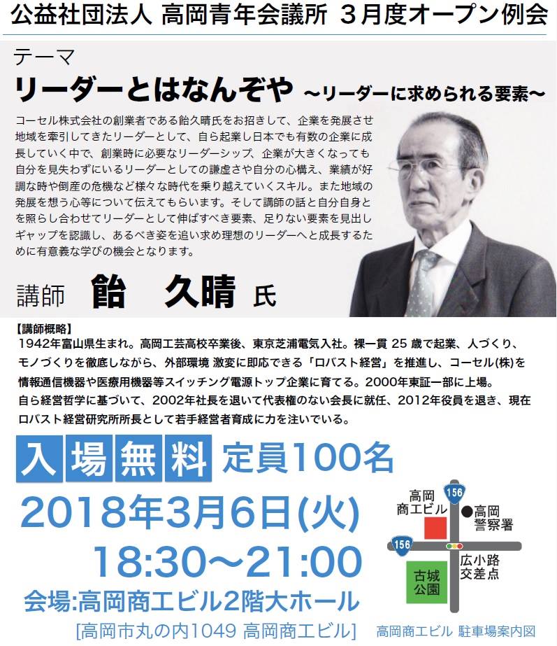 (公社)高岡青年会議所 2018/03/14 【イベント参加報告】(公社)高岡青年会議所 3月度オープン例会「リーダーとはなんぞや ~リーダーに求められる要素~」(3/6) ★詳しい情報はこちら★【高岡青年会議所の3月度オープン例会】(高岡青年会議所ホームページ)3月6日(火)。(公社)高岡青年会議所 3月度オープン例会が開催されました。講師に、コーセル株式会社創業者の飴 久晴先生をお招きし、「リーダーとはなんぞや ~リーダーに求められる要素~」と題して講演していただきました。20代で創業し、一代で大会社に成長させた講師の経験から、経営者やリーダーに必要な要素を語っていただきました。私は経営者ではありませんが・・・それでも心に響くものがありました。将来、地域を引っ張るリーダーになれるよう、今回学んだことを実践していけたらなと思います。 http://kirittotakaoka.ria10.com/takaokajc/201803141100【イベント参加報告】(公社)高岡青年会議所 3月度オープン例会「リーダーとはなんぞや ~リーダーに求められる要素~」(3/6)