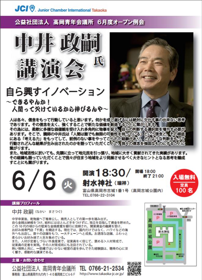 (公社)高岡青年会議所 2017/06/01 【イベント情報】(公社)高岡青年会議所 6月度オープン例会「自ら興すイノベーション~できるやんか!人間って欠けているから伸びるんや~」(6/6) ★詳しい情報はこちら★【広報幹事ブログ】ココが見どころ!6月度オープン例会(高岡青年会議所のホームページ)【6月度オープン例会】「自ら興すイノベーション~できるやんか!人間って欠けているから伸びるんや」(Facebookイベントページ)6月6日(火)、(公社)高岡青年会議所 6月度オープン例会が開催されます。今回の講師は(株)千房 代表取締役社長・中井政嗣氏をお迎えし「自ら興すイノベーション~できるやんか!人間って欠けているから伸びるんや」と題し講演していただきます。中井氏は大阪にお好み焼き専門店 千房をオープンし、現在は海外にも店舗を広げ63店舗を経営されています。中井氏の最大の魅力は人材育成術です。「人間は誰でも無限の可能性を持っている」という強い信念のもと、多様な価値観を受け入れ多角的に物事を判断し、企業、地域に貢献するべく人材を多く育成されてこられました。講演内容は全て講師自らの実体験を語っていただく内容となっており、皆様にとってそれぞれの思考にプラスになる材料が必ず得られ、今後、より良い結果を導く為の行動へと繋がると確信しております。ご聴講頂く皆様自身の成長はもちろんの事、私たちが住まう地域を、自らの手でさらにより良い地域へと発展させたい!そんな想いを実現へと導いてくれる例会にしたいと思っています。たくさんのご参加お待ちしております。なお、今回の例会の会場は「射水神社」となっておりますので、お間違えの無いよう、よろしくお願いします。(公社)高岡青年会議所 6月度オープン例会「自ら興すイノベーション~できるやんか!人間って欠けているから伸びるんや~」日時:2017年6月6日(火) 時間:18:30開演(18:00開場)~21:00終了 場所:射水神社 (〒933-0044 高岡市古城1−1) 地図はこちら(Google mapへリンクします。)主催・お問合:公益社団法人 高岡青年会議所事務局 TEL:0766-21-2534 http://kirittotakaoka.ria10.com/takaokajc/201706011000【イベント情報】(公社)高岡青年会議所 6月度オープン例会「自ら興すイノベーション~できるやんか!人間って欠けているから伸びるんや~」(6/6)