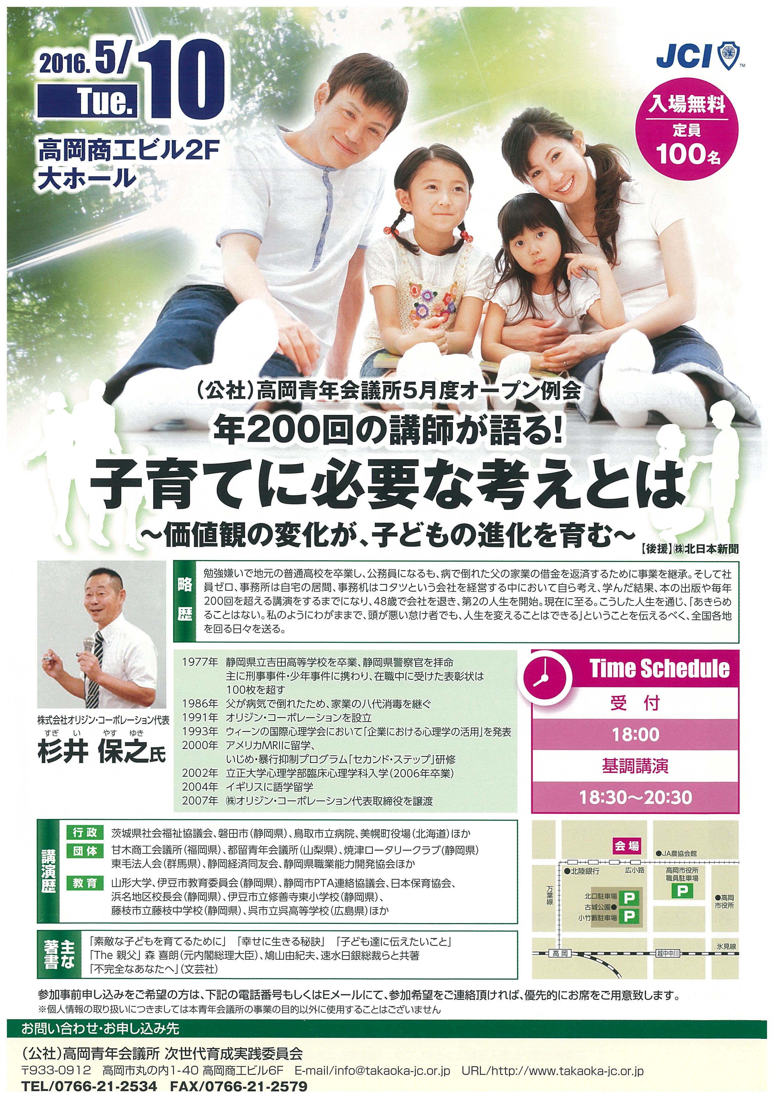(公社)高岡青年会議所 2016/05/07 【イベント情報・再告知】2016年度(公社)高岡青年会議所5月度オープン例会『子育てに必要な考えとは ~価値観の変化が、子どもの進化を育む~』(5/10) 2016年度公益社団法人高岡青年会議所5月度オープン例会のご案内(外部リンク)5月10日(火)、高岡商工ビル2階大ホールにて、2016年度(公社)高岡青年会議所 5月度オープン例会『子育てに必要な考えとは ~価値観の変化が、子どもの進化を育む~』が開催されます。私が今年度賛助会員として所属しております、次世代育成実践委員会の担当例会となります。年間200回の講演をこなされる、オリジン・コーポレーション代表の杉井保之氏を講師としてお招きし、自身の多彩な経験から、子育てに必要な親世代の価値観をご講演いただきます。入場無料となっておりますので、ぜひ多数のご参加お待ちしております。2016年度(公社)高岡青年会議所 5月度オープン例会『子育てに必要な考えとは ~価値観の変化が、子どもの進化を育む~』日時:5月10日(火) 18:30 ~ 20:30場所:高岡商工ビル2F大ホール講師:杉井 保之 氏(オリジン・コーポレーション代表) ~講師プロフィール~ 略歴 1977年 静岡県立吉田高等学校を卒業、静岡県警察官を拝命 主に刑事事件・少年事件に携わり、在職中に受けた表彰状は100枚を超す 1986年 父が病気で倒れたため、家業の八代消毒を継ぐ 1991年 オリジン・コーポレーションを設立 1993年 ウィーンの国際心理学会において「企業における心理学の活用」を発表 2000年 アメリカMRIに留学 いじめ・暴行抑制プログラム「セカンド・ステップ」研修 2002年 立正大学心理学部臨床心理学科入学(2006年卒業) 2004年 イギリスに語学留学 2007年 ㈱オリジン・コーポレーション代表取締役を譲渡 講演歴 行政:茨城県社会福祉協議会、磐田市(静岡県)、鳥取市立病院 ほか 団体:甘木商工会議所(福岡県)、都留青年会議所(山梨県)、東毛法人会(群馬県)、 静岡経済同友会 ほか 教育:山形大学、伊豆市教育委員会(静岡県)、静岡市PTA連絡協議会、浜名地区校長会(静岡県)、 伊豆市立修善寺東小学校(静岡県)、藤枝市立藤枝中学校(静岡県)、 呉市立呉高等学校(広島県)ほか 主要著書 ・『素敵な子どもを育てるために』 ・『幸せに生きる秘訣』 ・『The 親父』森 喜朗(元内閣総理大臣)、鳩山由紀夫らと共著 ・『不完全なあなたへ』(文芸社) 演題:『子育てに必要な考えとは~価値観の変化が、子どもの進化を育む~』~お問い合わせ先~(公社)高岡青年会議所 次世代育成実践委員会 横田誠二TEL0766-21-2534 FAX0766-21-2579〒933-0912 高岡市丸の内1-40 高岡商工ビル6FE-mail:info@takaoka-jc.or.jpURL:http://www.takaoka-jc.or.jp http://kirittotakaoka.ria10.com/takaokajc/201605072000【イベント情報・再告知】2016年度(公社)高岡青年会議所5月度オープン例会『子育てに必要な考えとは ~価値観の変化が、子どもの進化を育む~』(5/10)