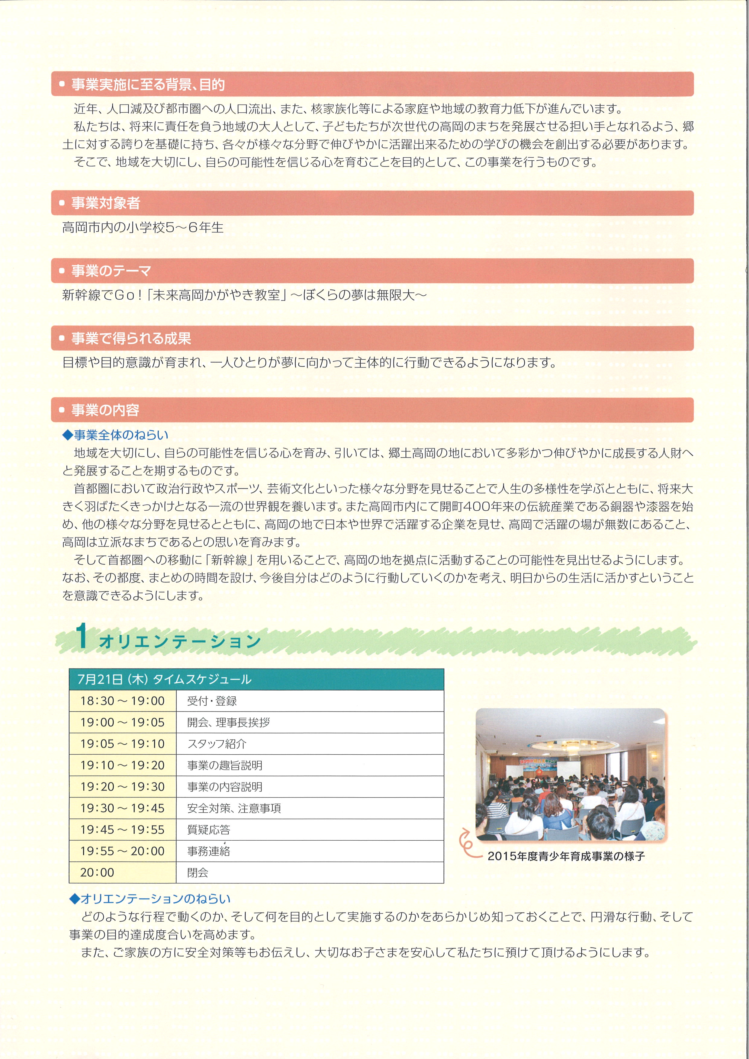 (公社)高岡青年会議所 2016/06/07 小学生対象体験事業『新幹線でGo!「未来高岡かがやき教室」 ~ぼくらの夢は無限大~』(7/26・8/4~6) 青少年育成事業『新幹線でGo!「未来高岡かがやき教室」~ぼくらの夢は無限大~』開催のご案内(高岡青年会議所ホームページ)本年度賛助会員として所属しております、2016年度(公社)高岡青年会議所 次世代育成実践委員会で、高岡の「みらいづくり」に取り組んでおります。これまで、高校生に対する有権者教育、親世代に対する講演会を行ってきましたが、もうひとつ、小学生を対象とした体験事業に取り組みます。ぜひ、ご参加をお待ちしております!!新幹線でGo!「未来高岡かがやき教室」 ~ぼくらの夢は無限大~募集人数:40名募集学年:高岡市内の小学5年生・6年生募集締め切り:2016年6月30日(火)必着応募資格:事業全てに参加できる方 健康状態が良好で、規律に従い団体行動が出来る方参加決定:応募者多数の場合は、厳正なる抽選により参加者を決定致します(キャンセル等が出た場合、2次募集有り)。尚、参加決定は郵送にて通知致しますが、参加費の振り込みをもって最終決定とします。申し込み方法:(公社)高岡青年会議所事務局へ郵送・持参・FAX主催:2016年度(公社)高岡青年会議所 担当・次世代育成実践委員会後援:高岡市、高岡市教育委員会~事業の詳細~オリエンテーション日時:2016年7月21日(水)19時~20時場所:高岡商工ビル802・803会議室スケジュール18時30分~19時 ・・・受付・登録19時~19時5分 ・・・開会、理事長挨拶19時5分~19時10分 ・・・スタッフ紹介19時10分~19時20分 ・・・事業の趣旨説明19時20分~19時30分 ・・・事業の内容説明19時30分~19時45分 ・・・安全対策、注意事項19時45分~19時55分 ・・・質疑応答19時55分~20時 ・・・事務連絡20時 ・・・閉会体験事業(高岡編)日時:2016年7月26日(火)8時~16時30分スケジュール7時30分~8時 ・・・受付・登録8時30分~9時50分 ・・・高岡市デザイン・工芸センター、富山県総合デザインセンター(1時間20分)10時40分~12時 ・・・三芝硝材㈱(1時間20分)12時20分~13時 ・・・道の駅万葉の里高岡 昼食13時15分~14時35分 ・・・BBSジャパン㈱(1時間20分)15時10分~16時30分 ・・・まとめ16時30分 ・・・解散(高岡商工ビル)体験事業(首都圏編)日時:2016年8月4日(木)~8月6日(土)宿泊地:富山県赤坂会館スケジュール8月4日(木)6時40分~7時10分 ・・・受付・登録7時22分~9時44分 ・・・移動(北陸新幹線「かがやき」)10時30分~11時30分 ・・・国会議事堂(参議院)(1時間)11時45分~12時45分 ・・・参議院議員会館内会議室(昼食)(1時間)13時~14時30分 ・・・文部科学大臣政務官室、情報ひろば(1時間30分)14時50分~16時30分 ・・・遊就館(1時間40分)17時~18時 ・・・まとめ(1時間)19時~20時 ・・・昼食20時~21時 ・・・入浴21時30分 ・・・就寝8月5日(金)7時~8時 ・・・朝食8時40分 ・・・宿舎出発9時30分~11時 ・・・日本体育大学(1時間30分)11時40分~13時30分 ・・・明治座13時30分~14時 ・・・昼食(明治座内別室にて)15時30分~16時30分 ・・・お土産購入時間17時~18時 ・・・まとめ(1時間)19時~20時 ・・・昼食20時~21時 ・・・入浴21時30分 ・・・就寝8月6日(土)6時30分~7時30分 ・・・朝食8時15分 ・・・宿舎出発10時~11時10分 ・・・JAXA筑波宇宙センター(1時間10分)12時56分~15時59分 ・・・移動(北陸新幹線)この間車内にて昼食15時59分~16時20分 ・・・移動(徒歩)16時30分~17時30分 ・・・まとめ(1時間)17時30分 ・・・解散(高岡テクノドーム) http://kirittotakaoka.ria10.com/takaokajc/201606071900小学生対象体験事業『新幹線でGo!「未来高岡かがやき教室」 ~ぼくらの夢は無限大~』(7/26・8/4~6)