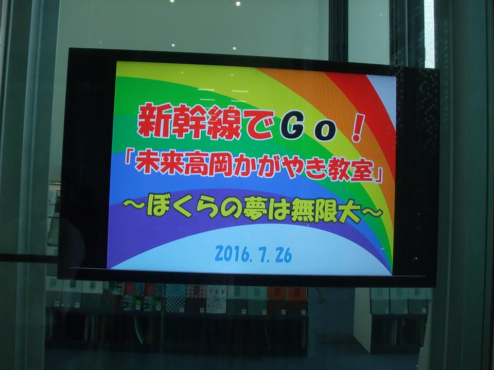 (公社)高岡青年会議所 2016/07/27 青少年育成事業「新幹線でGo!『未来高岡かがやき教室』~ぼくらの夢は無限大~」高岡編(7/26) 7月26日(火)。(公社)高岡青年会議所主催の青少年育成事業「新幹線でGo!『未来高岡かがやき教室』~ぼくらの夢は無限大~」の高岡編を実施いたしました。(写真は、訪問先の三芝硝材㈱さんが入口モニターに映し出してくださったもの)この事業は、公募で集まった高岡市の小学5~6年生50名が、高岡編と首都圏編に参加します。高岡編は、下記の行程で開催されました。①高岡市デザイン・工芸センター、富山県総合デザインセンター②三芝硝材㈱ 道の駅「万葉の里高岡」(昼食:高岡昆布飯)③BBSジャパン㈱まずは戸出オフィスパークにある「高岡市デザイン・工芸センター」と「富山県総合デザインセンター」へ。高岡銅器・高岡漆器といった高岡の伝統工芸が、3Dプリンターといった先端技術を取り入れて進化し続けている姿を学びました。続けて、岩坪工業団地にある三芝硝材㈱へ。北陸新幹線の窓ガラスのほか、首都圏のビルの窓ガラスなど全国的に活躍する企業です。高岡には、銅器や漆器といった伝統産業以外にも、様々な産業があることを学びました。昼食は、道の駅「万葉の里高岡」で、高岡昆布飯。高岡の名物を楽しみました。午後は、六家にあるBBSジャパン㈱へ。F1用のホイールで世界的な活躍をする企業です。ここで、この高岡からも、広く日本や世界で活躍する企業があることを学びました。班を引率する立場として参加させていただきましたが、私自身も知らないことが多く、高岡が秘めた可能性を学ぶことができたなと思います。この後、首都圏編が8月4日(木)~6日(土)の2泊3日で開催されます。高岡の未来を担う青少年の育成に、役立てればなと思います。7月26日(火)青少年事業 高岡編のご報告(高岡青年会議所のホームページより)世界で活躍、ふるさとの産業学ぶ 高岡JCの教室で児童(富山新聞より) http://kirittotakaoka.ria10.com/takaokajc/201607271900青少年育成事業「新幹線でGo!『未来高岡かがやき教室』~ぼくらの夢は無限大~」高岡編(7/26)