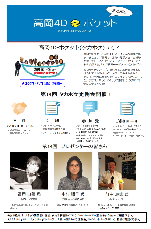 高岡4D-ポケット タカポケ 2017/03/27 【イベント情報】高岡4D-ポケット タカポケ 第14回定例会 ※会員制導入(4/7) ★詳しい情報はこちら★タカポケ 第14回定例会(Facebookイベントページ)高岡4D-ポケット(たかおかよじげんポケット=通称「タカポケ」)の第14回定例会開催日決定!★参加お申込受付中★「ぜーんぶジブンゴト!」トナリのこともジブンゴト、マチのこともジブンゴト。高岡のために何かやりたい!自分の夢をみんなに応援してほしい!もっとこうしたら街がよくなる!という熱いキモチをお持ちの皆さんの参加をお待ちしています。高岡4D-ポケット タカポケ 第14回定例会日時:2017年4月7日(金)19:00~(18:30受付開始)場所:メリースマイルカフェ(高岡市本丸町13-10)定員:30名参加費:500円 ※お得な会員制度を始めます! 4月から9月会員 会員の方は全額で2,000円懇親会:※定例会終了後、楽しすぎる懇親会をご用意しています。(参加費1,500円予定)~参加方法~ ・Facebook:イベントページの「イベント参加ボタンを押す」&「コメント」を必ずお願いします。定例会&懇親会参加についてもご回答ください。・Tel:事務局へ直接お申込みください。 080-3749-8770(担当:ますかた)~プレゼンター紹介~宮田 由理 氏(山町茶屋)・・・「高岡を音楽の街にしたい!もっと夜音茶屋LIVE!」中村 順子 氏(NPO多言語多読)・・・「高岡駅構内に洋書カフェがほしい!」竹中 志光 氏(TM工房)・・・「えんとつ町のプペル展、高岡開催についてのアイデア募集!」※ご注意※会場が変更になる場合がございます。開催日が近くなりましたら、必ずイベントページを再度ご確認くださいませ。当日はプロジェクトアイデアを持ったプレゼンターの発表内容を聞いたあと、そのアイデアを参加者全員でブラッシュアップ。さらに、そのプロジェクトを応援し、一緒にがんばってくれる協力者を募ります。(次回以降のプレゼンターさんをただいま募集中!)アイデアを出し合って、思いを形にし、仲間と一緒に高岡を盛り上げるプロジェクトをどんどん実行していきましょう。誰かの夢をみんなで叶える、高岡4D-ポケット(タカポケ)。ぜひご参加ください! PR http://kirittotakaoka.ria10.com/takapoke/201703271700【イベント情報】高岡4D-ポケット タカポケ 第14回定例会 ※会員制導入(4/7)