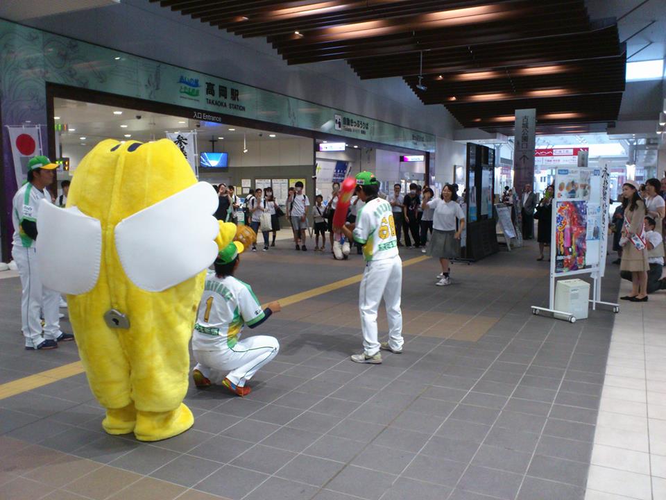 プロ野球独立リーグ・ルートインBCリーグ 富山GRNサンダーバーズの選手と、高岡市選挙啓発サポーター「T-voice」最年少メンバー(女子高生)による始球式「一票入魂セレモニー」が開催。