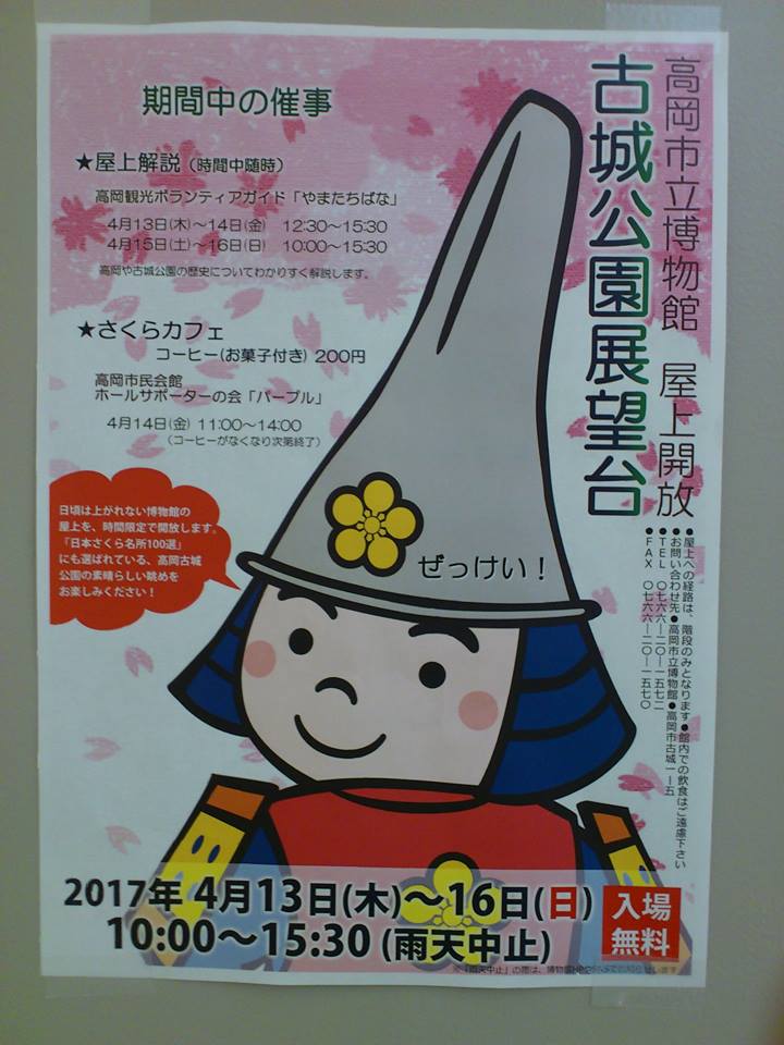 高岡観光ボランティアガイド「やまたちばな」 2017/04/14 【イベント参加報告】高岡市立博物館屋上開放「古城公園展望台」(4/13・14) 4月13日(木)~16日(日)の4日間、高岡古城公園内にある高岡市立博物館にて、屋上開放「古城公園展望台」が開催されております。屋上開放中、高岡観光ボランティアガイド「やまたちばな」による「屋上解説」も随時行われておりますが、昨日13日(木)と今日14日(金)の2日間、私が担当させていただきました。駆け出しガイドとしてはかなりの大役。不安しかありませんでしたが、おかげさまで無事2日間やり遂げることができました。主に、来場された方の質問にお答えする・・・という感じでしたが、実際には質問はなかなか来ません。そこで、こちらから声をかけてお話する、一定の時間に注目してもらい話をする、といったことも積極的に行っていくべきなのですが、そこまでの知識やスキルを身に着けるにはまだまだ修行が必要です・・・。ガイドとして反省点ばかりの2日間でしたが、今日の終わり頃に、九州から来られた方に高岡城の歴史解説をし、喜んでいただけたことが何よりも嬉しい出来事でした。これからもガイド活動を通して、高岡古城公園の魅力を多くの方に伝えていけたらなと思います。ちなみに、2日目の今日限定で、高岡市民会館ホールサポーターの会「パープル」の皆様による「さくらカフェ」が開催されました。さて、普段は入れない博物館の屋上から見える古城公園の桜風景。とてもいい眺めでした。なお、初日の昨日は多くの地元メディアが取材に来られました。昨夜はテレビ局2局のニュースで、今朝は新聞3紙の朝刊で取り上げられました。その効果もあってか、今日は多くの方が来場されました。私のガイドとしての役目は今日で終わりましたが、屋上開放はあと2日間開催されます。ぜひ、最高の展望台を楽しんでいただけたらと思います!高岡古城公園 屋上から眺めるサクラはいかが?(チューリップテレビ 2017年4月13日)(上記記事より引用) この映像は日中、高岡市立博物館の屋上から撮影したものです。 屋上の高さはおよそ15メートル、園内を一望することができます。 高岡市では7年前からサクラが満開となる時期のみ屋上を一般開放していて、午前10時から午後3時半まで眺めを楽しむことができます。 13日から16日までの期間限定となっています。 期間中はボランティアガイドによる古城公園の歴史解説なども行なわれ、普段は見ることができない景色に訪れた人からは感動の声が挙がっていました。(引用終わり) 見下ろす花も格別 高岡 古城公園展望台を開放(北陸中日新聞 2017年4月14日)(上記記事より引用) 高岡市の古城公園内にある市博物館の屋上「古城公園展望台」が十三日開放され、花見客でにぎわった。十六日まで。 展望台は通常は閉鎖しているが、毎年花見シーズンに開放。園内の桜や堀などが一望でき、高岡大仏や二上山、好天ならば立山連峰も望める。期間中は、高岡観光ボランティアガイド「やまたちばな」の会員が古城公園の歴史や見どころを解説する。 来館者に「どちらから来られましたか」と声を掛けながら質問に答えていたガイドの福岡経さん(25)=高岡市鐘紡町=は「古城公園の魅力を多くの人に伝えたい」と話す。来館した女性は「初めて来ました。下で間近に見る桜も良いですが、屋上から桜一面の公園を見るのも素晴らしい」と喜んでいた。 ガイドの時間は十四日は午後零時半~三時半、十五、十六両日は午前十時~午後三時半。十四日午前十一時~午後二時には、高岡市民会館ホールサポーターの会「パープル」がコーヒーとお菓子を二百円で提供する「さくらカフェ」を開く。展望台の入場は無料。雨天は中止する。 (武田寛史)(引用終わり)園内の桜一望 高岡市立博物館 屋上開放(富山新聞 2017年4月14日)(上記記事より引用) 高岡市立博物館の屋上開放行事「古城公園展望台」が13日始まり、来館者が見ごろを迎えた高岡古城公園内の桜を満喫した。 日本さくら名所100選に指定されている高岡古城公園は、ソメイヨシノやコシノヒガンザクラなど18種類約1800本が植えられている。高さ12・5メートルの屋上からは、桜とともに二上山や立山連峰を眺めることができる。 来館者は高岡観光ボランティアガイド「やまたちばな」の解説に耳を傾けながら、情緒豊かな春の景色を楽しんだ。射水市大島北野の銅版画作家円戸智さん(55)は「上から見る桜もきれいだった」と話した。 入場は無料で、午前10時~午後3時半まで開放される。16日まで。14日は市民会館ホールサポーターの会「パープル」のさくらカフェが開設される。(引用終わり) PR http://kirittotakaoka.ria10.com/yamatachibana/201704142300【イベント参加報告】高岡市立博物館屋上開放「古城公園展望台」(4/13・14)